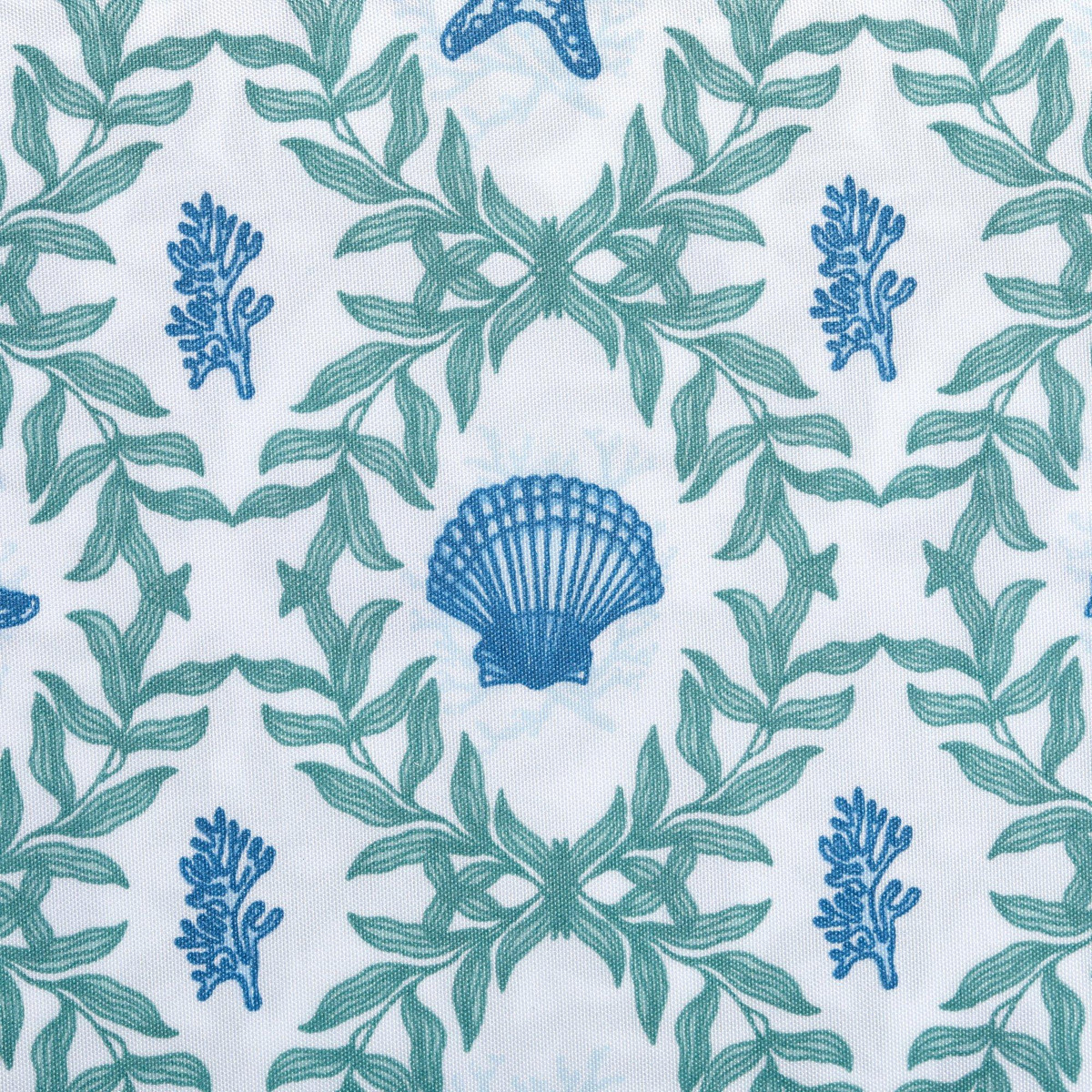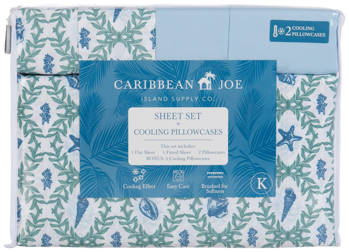 Bring the ocean to your bedroom with this stylish sheet set by Caribbean Joe. Inspired by the flora and fauna of the ocean and by the garden, this set features a seaweed trellis, seashells and starfish in blue and green hues. It includes a flat sheet, fitted sheet, 2 printed pillowcases, and 2 cooling pillowcases. Fabrication is 100% polyester. Fitted sheet pocket depth is 12 in.