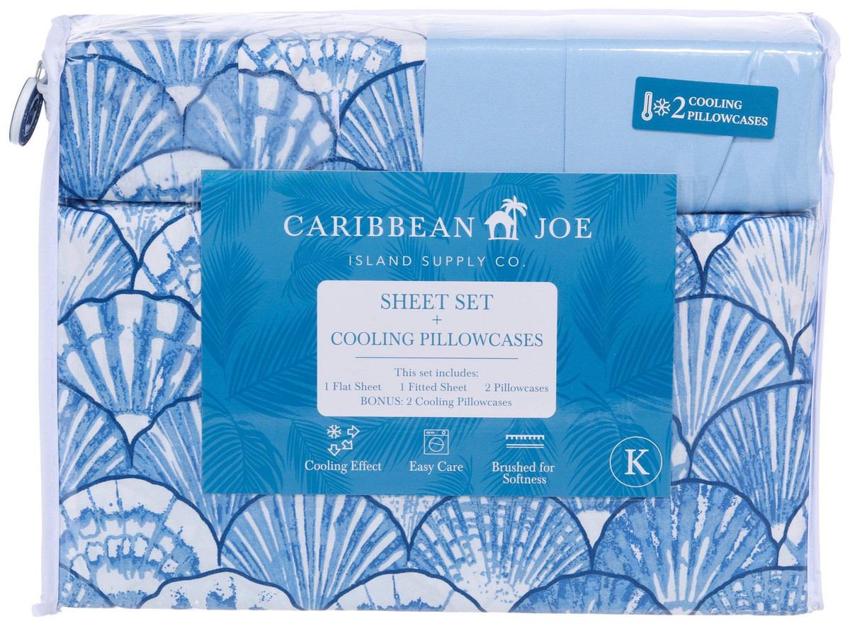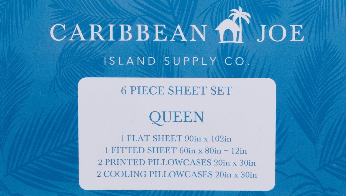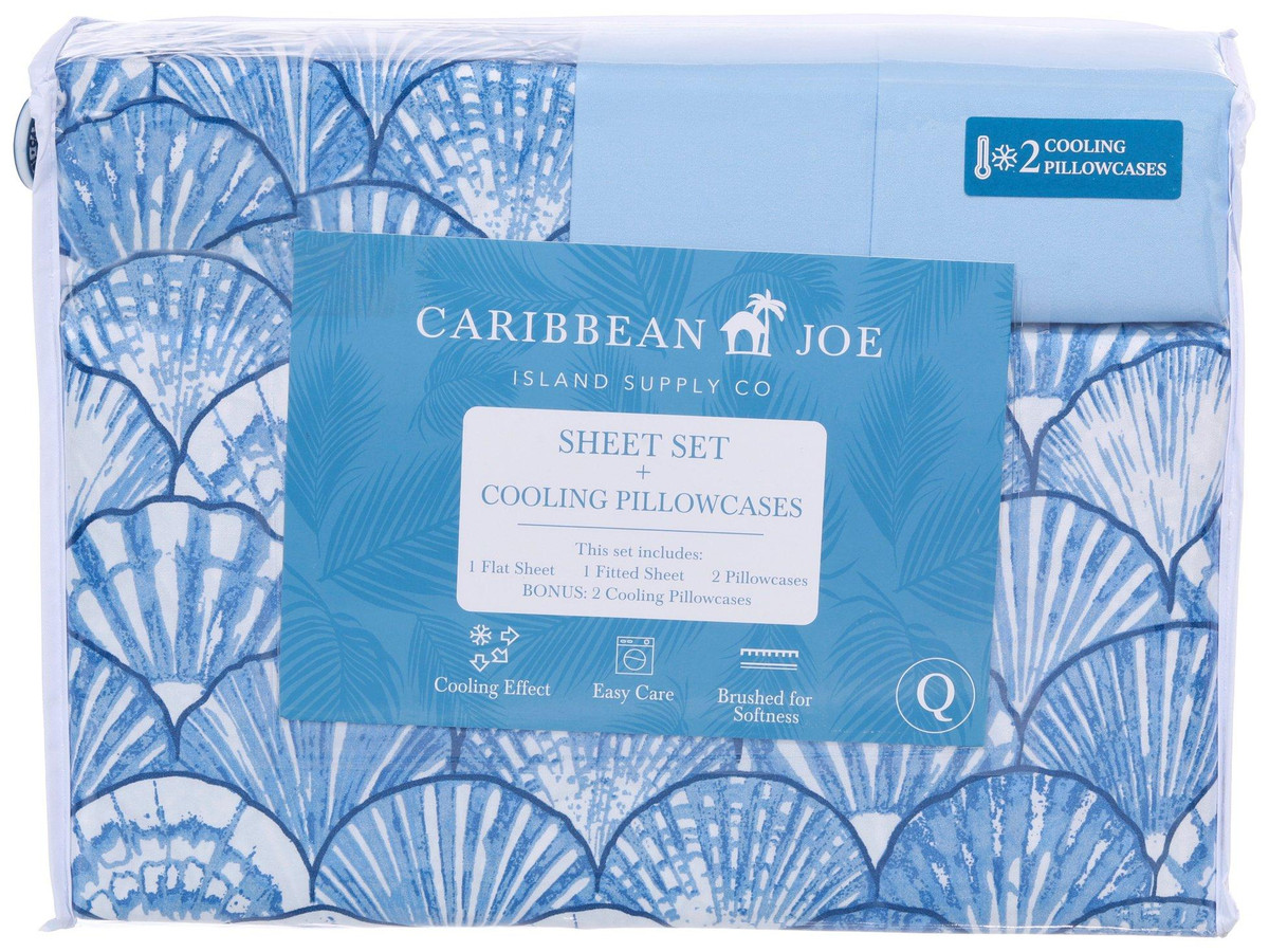 Bring the coast to your bedroom with this stylish and colorful sheet set by Caribbean Joe. Inspired by the beach, ocean, seaside, and shore this set features blue Shells! It includes a flat sheet, fitted sheet, 2 printed pillowcases, and 2 soild cooling pillowcases. Fabrication is 100% polyester. Fitted sheet pocket depth is 12 in.