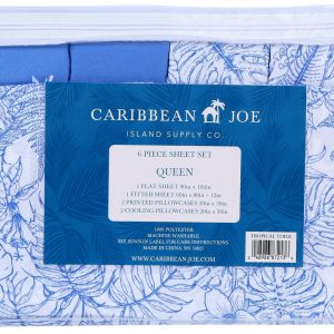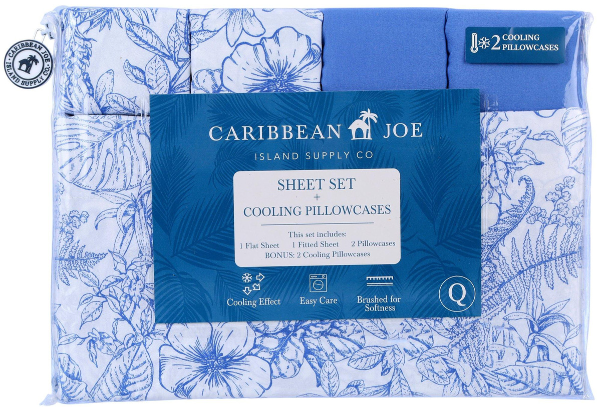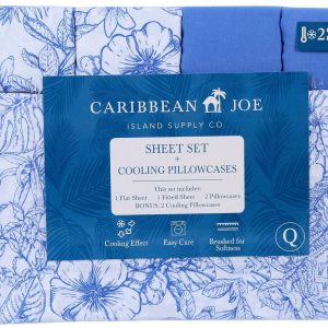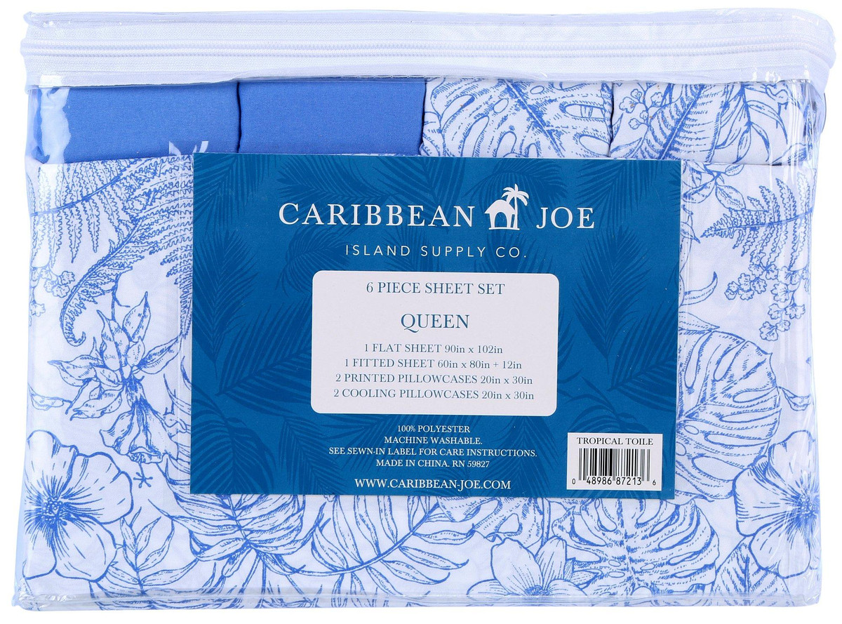 Bring the coast to your bedroom with this stylish and colorful sheet set by Caribbean Joe! It includes a flat sheet, fitted sheet, 2 printed pillowcases, and 2 cooling pillowcases. Fabrication is 100% polyester. Fitted sheet pocket depth is 12 in.