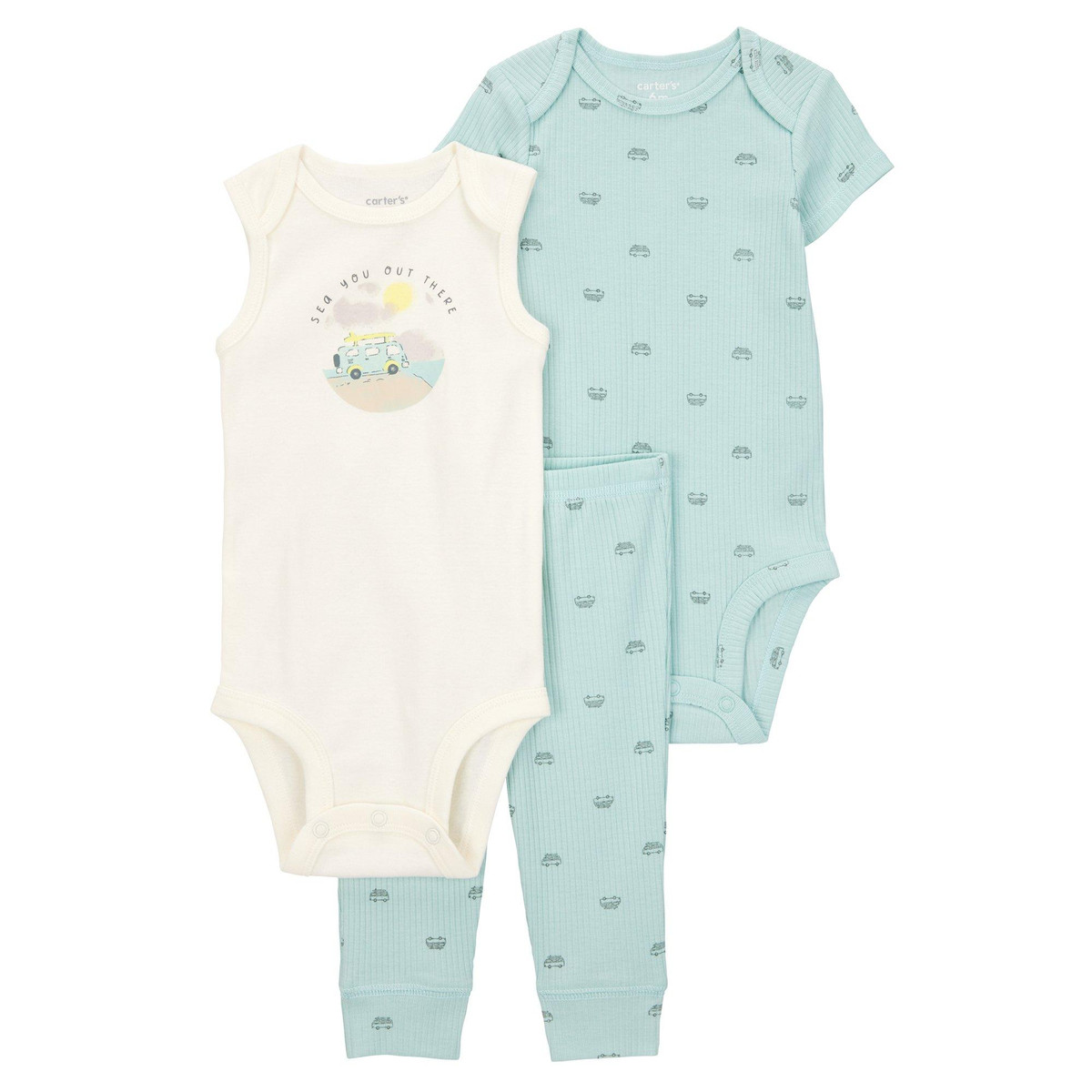 Stock up on three adorable pieces for your sweet one, complete with two bodysuits and a pair of easy on pants. This set features: Short Sleeves,Overlap shoulders for easy over the head, Strong snaps keep up with wear, wash, repeat, Covered elastic waistband for a comfy fit. Bodysuits: 100% cotton and 60% cotton, 40% polyesterPants: 60% cotton, 40% polyester