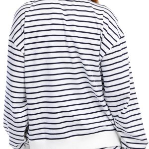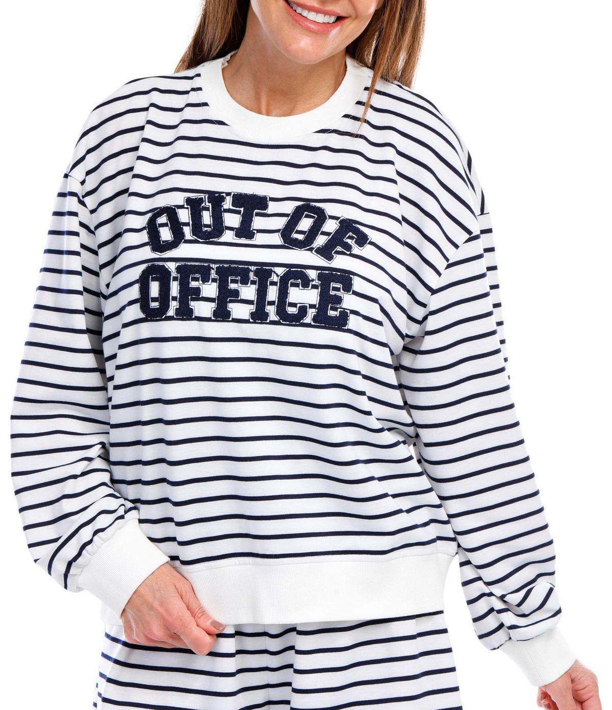 Stay cozy and stylish with this Long Sleeve Sweatshirt. Featuring a textured Out of Office motif and a chic striped print, this sweatshirt adds a playful touch to your casual wardrobe. The classic crew neck design ensures a comfortable fit, perfect for relaxed days or casual outings. Embrace the laid-back vibes and effortless style with this unique and comfortable piece. Enjoy the perfect blend of fashion and comfort with this standout sweatshirt. Fabrication is 95% polyester, 5% spandex.