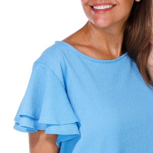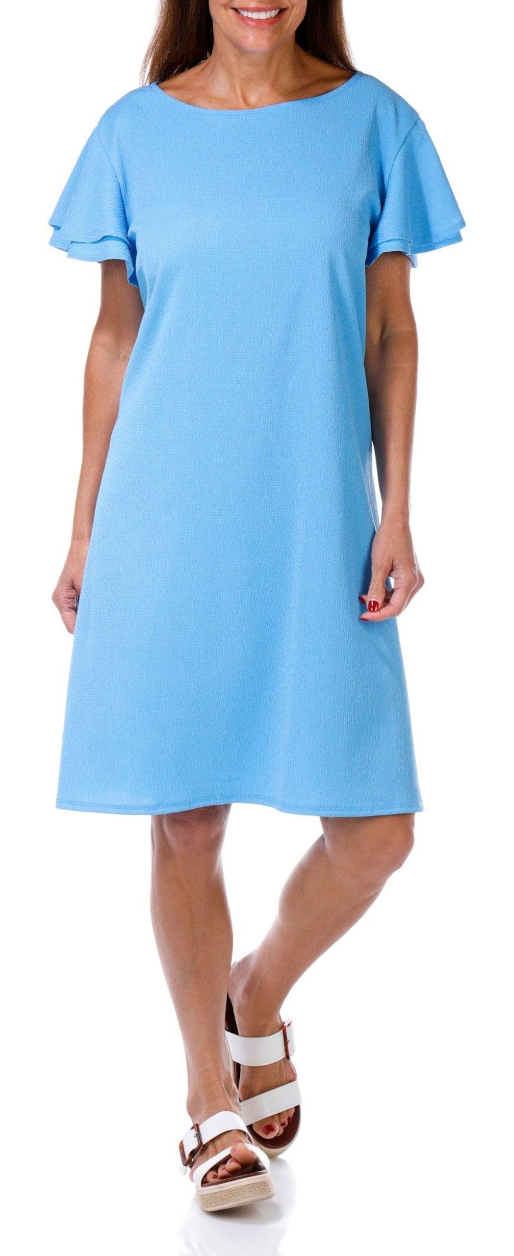 Add a touch of charm with this Short Sleeve Dress, featuring ruffle sleeves and a soft textured fabric. Falling to a flattering knee length, it is perfect for casual outings, brunch dates, or warm weather days. Fabrication is 92% polyester, 8% spandex.