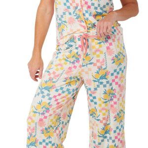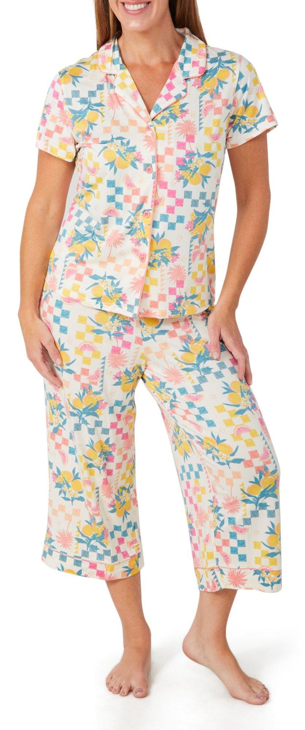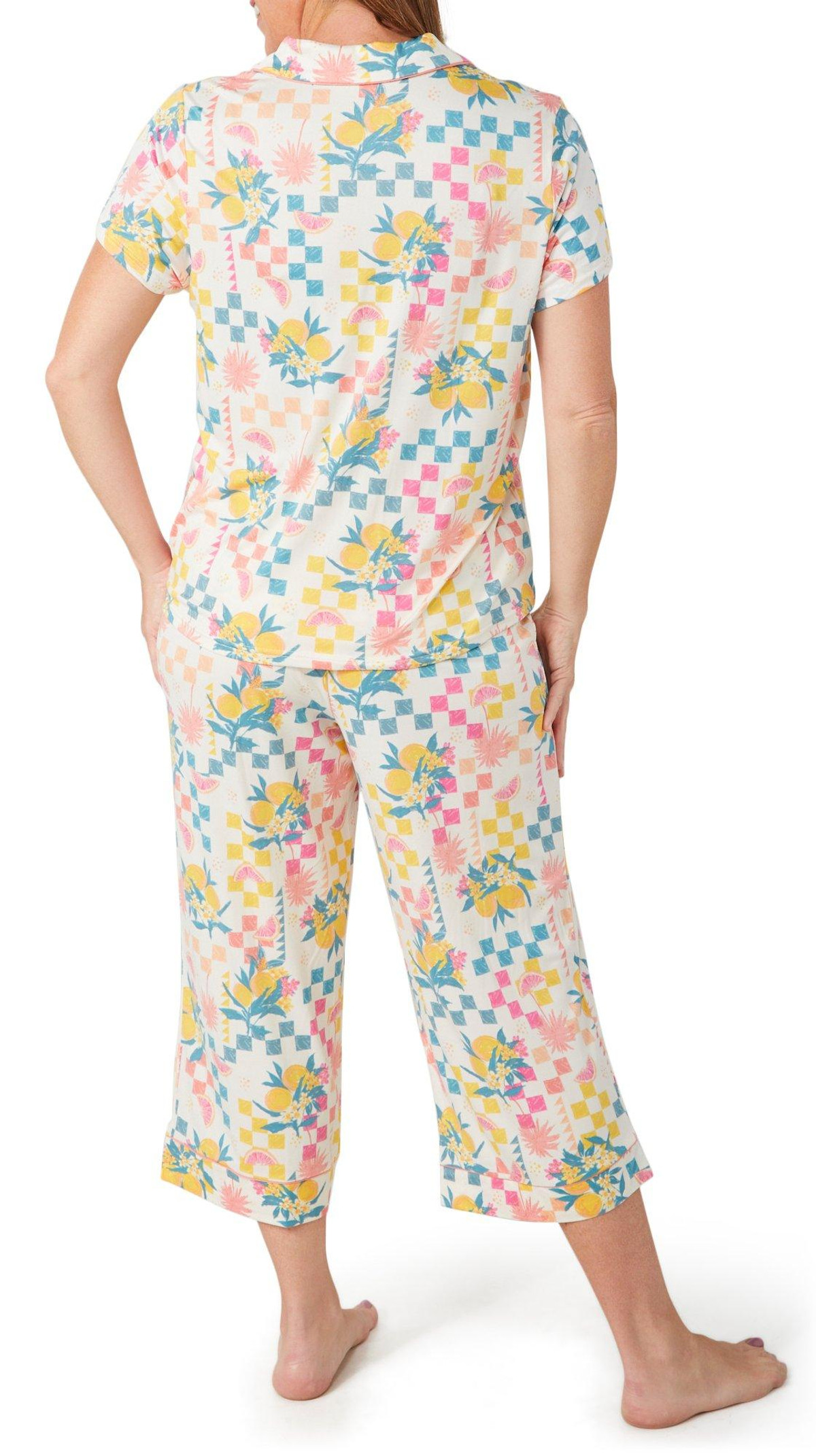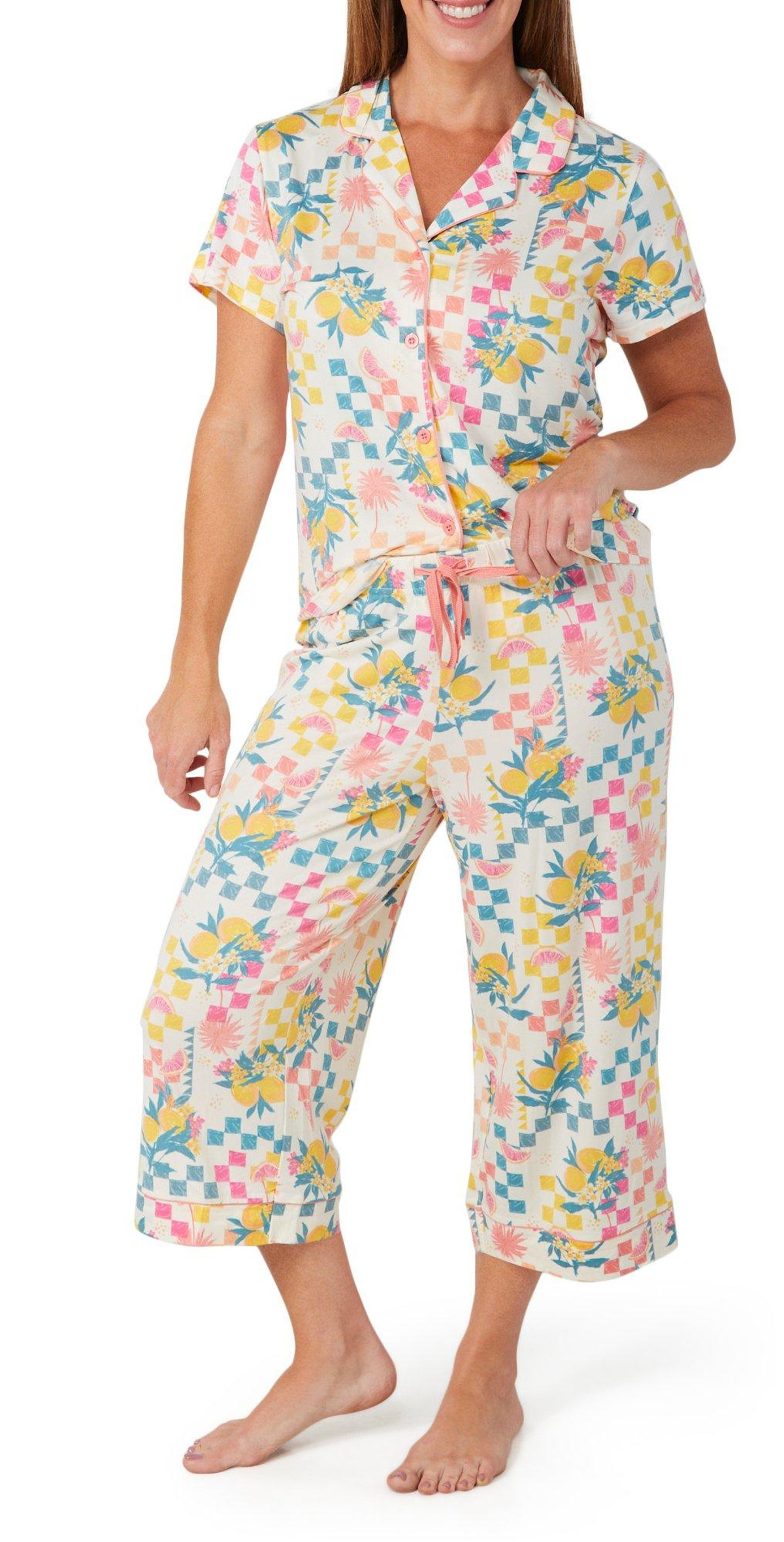 Drift into comfort with this 2 piece pajama set, featuring a playful print pattern that adds a touch of charm. The short sleeve buttoned top offers a relaxed fit and classic style, perfectly paired with matching bottoms for a coordinated, cozy look. Ideal for lounging or unwinding, this set blends softness and style for everyday ease. Fabrication is 95% polyester, 5% spandex.