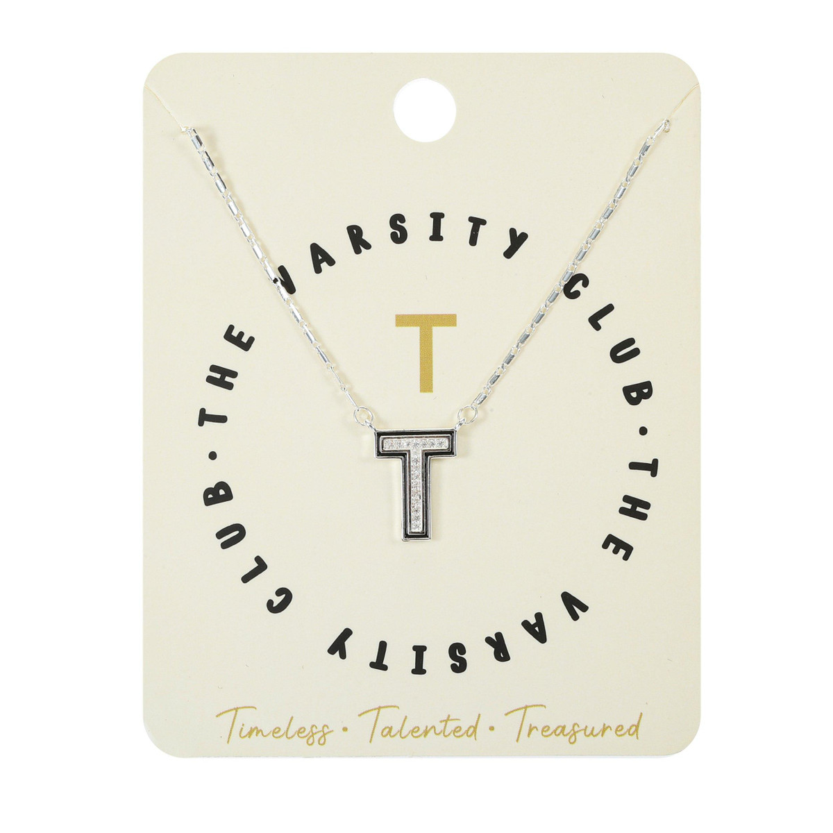 Add a personal touch with this varsity letter T initial necklace. Featuring a silver tone chain and sparkling cubic zirconia stones, this necklace blends classic style with a hint of school spirit. A perfect accessory for everyday wear or gifting.
