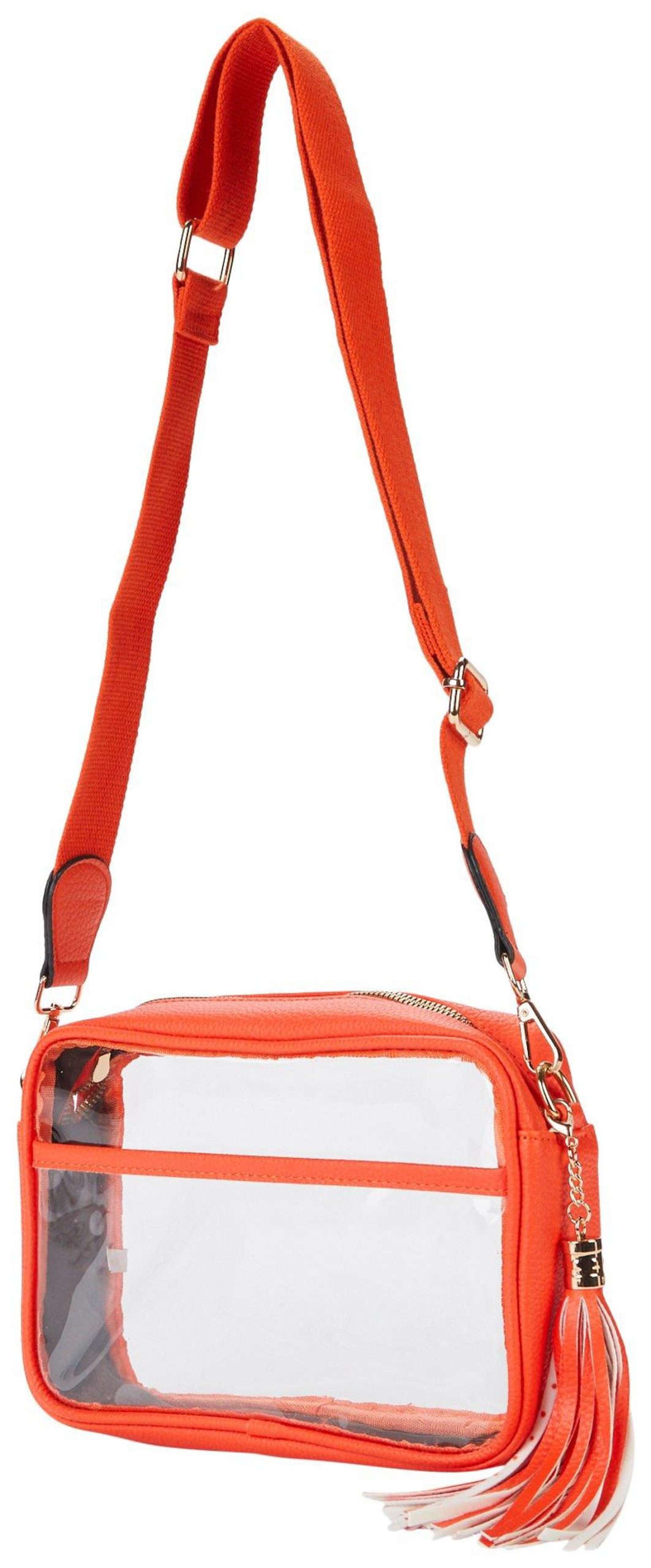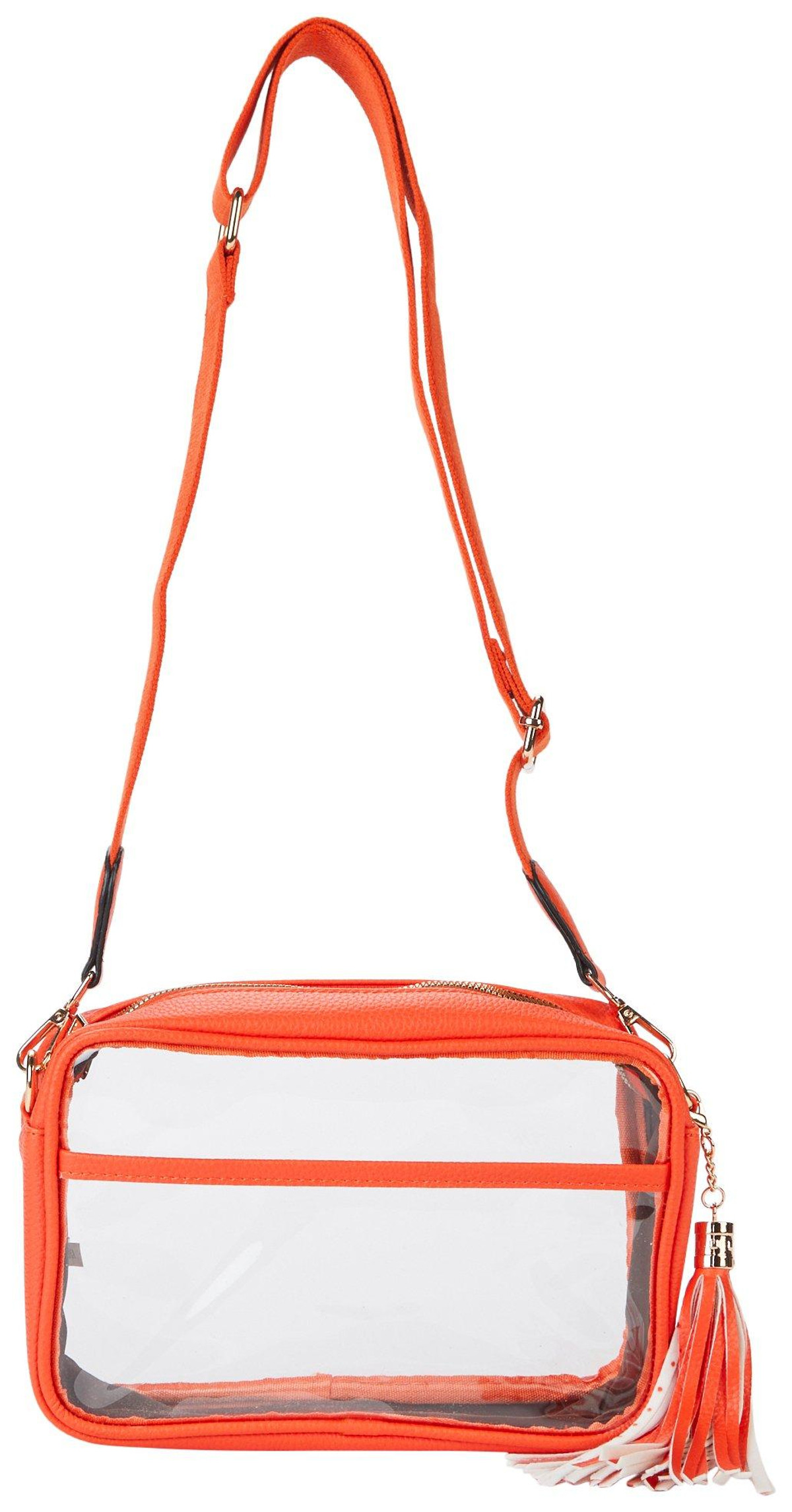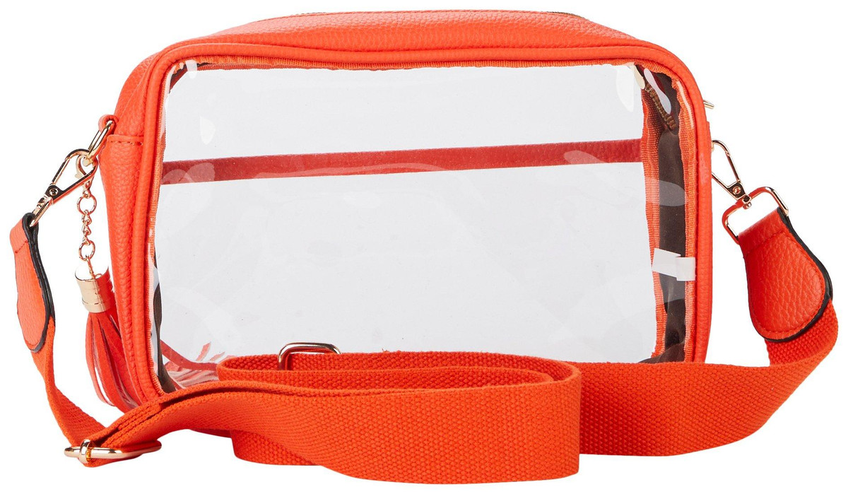 Stay stadium-ready and stylish with this 10×7 inch clear crossbody bag. Made from durable transparent material, it features a trendy tassel, gold-tone hardware, and one exterior slip pocket for easy access. The adjustable strap offers hands-free convenience. Perfect for concerts, festivals, and game days, this stadium-approved clear bag blends fashion and function effortlessly. Measures 10 in x 2 in x 7 in.