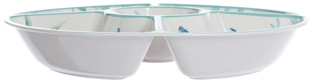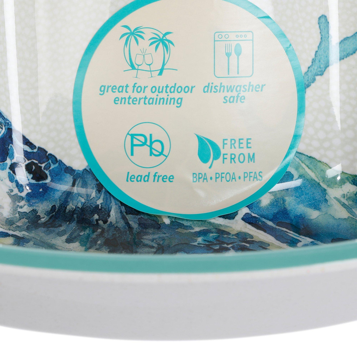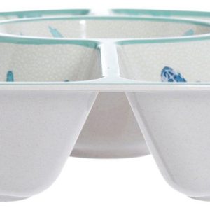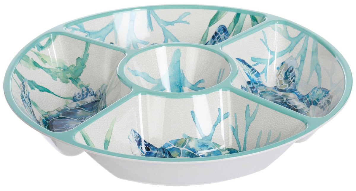 Serve in style with this 15 inch melamine divided serving bowl, designed with a sea turtle design in soothing ocean tones. Perfect for appetizers, chip and dip, or small bites, it adds a touch of seaside elegance to casual meals, picnics or outdoor entertaining. Fabrication is 100% melamine. Measures approximately 15 in round x 2.5 in.