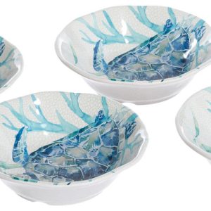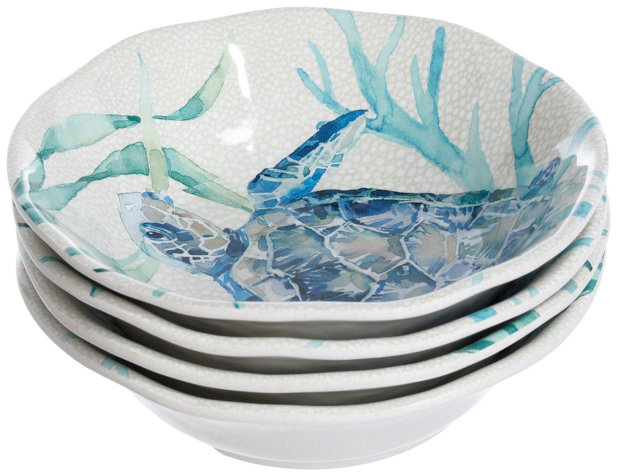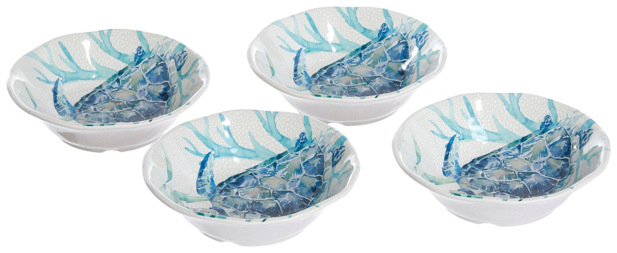 Add coastal charm to your table with this 4 pack of round melamine cereal bowls, featuring an ocean-inspired sea turtle design. Durable and lightweight, they blend everyday functionality with seaside elegance, making them ideal for casual meals or outdoor entertaining. Fabrication is 100% melamine. Measures approximately 7 in round x 2 in.