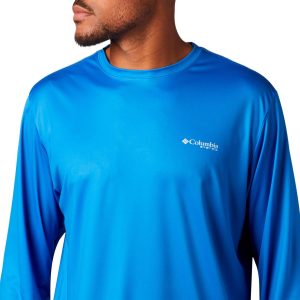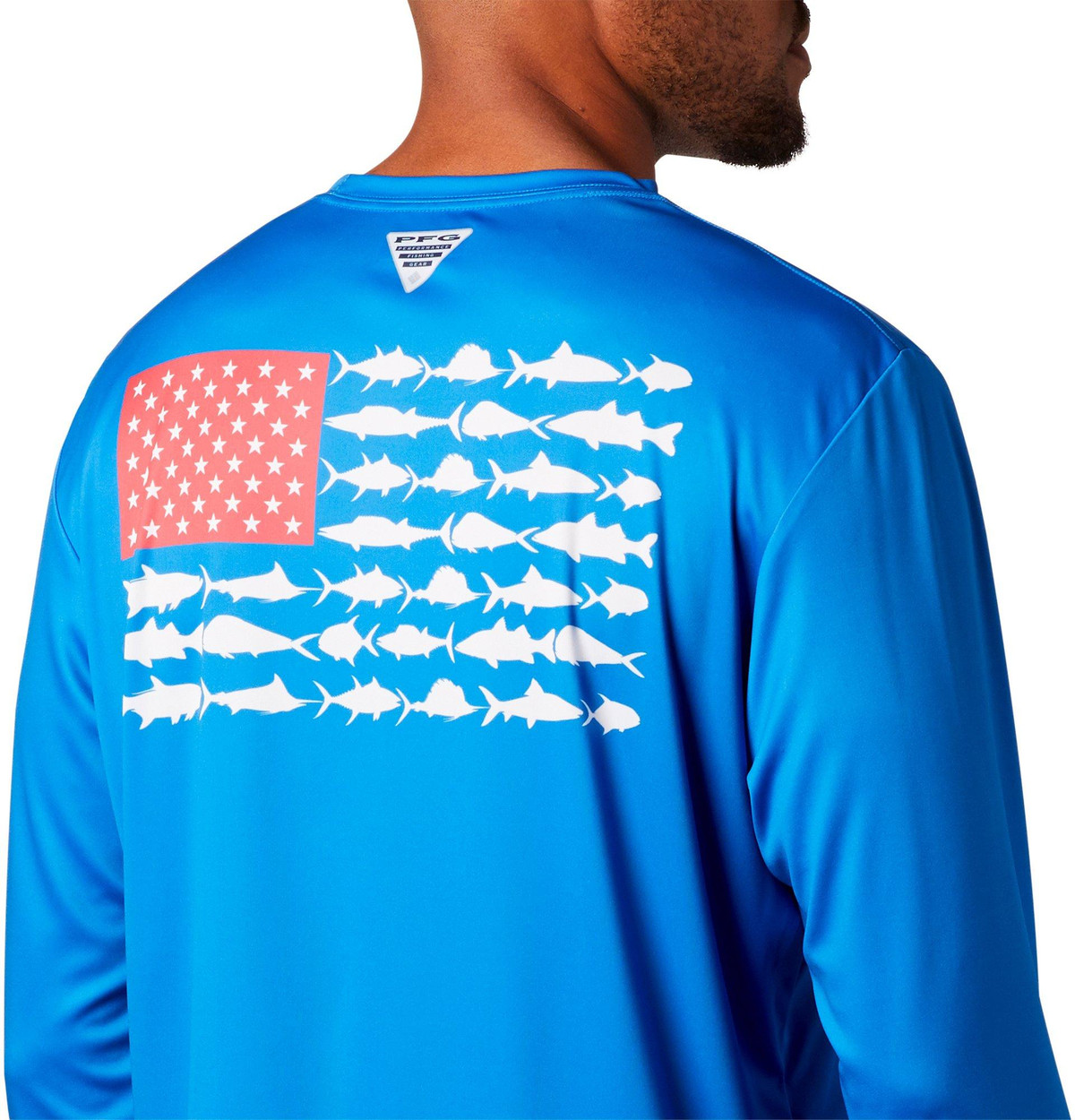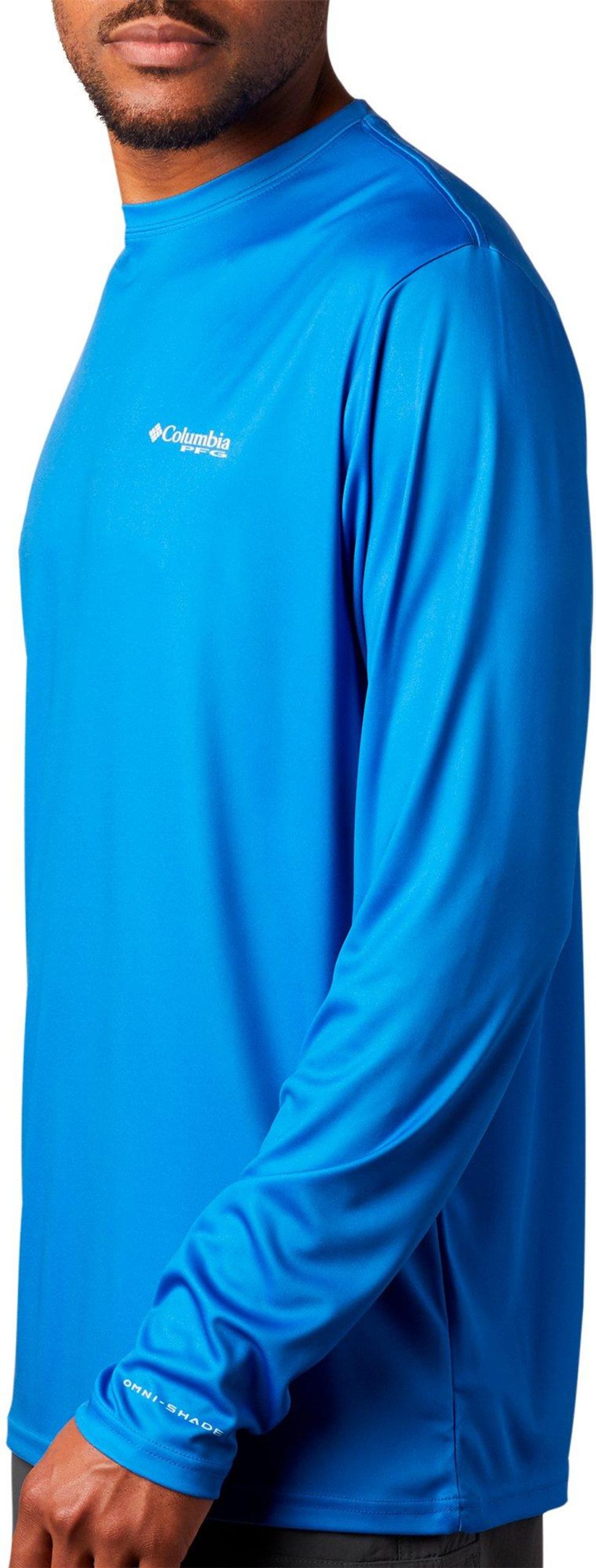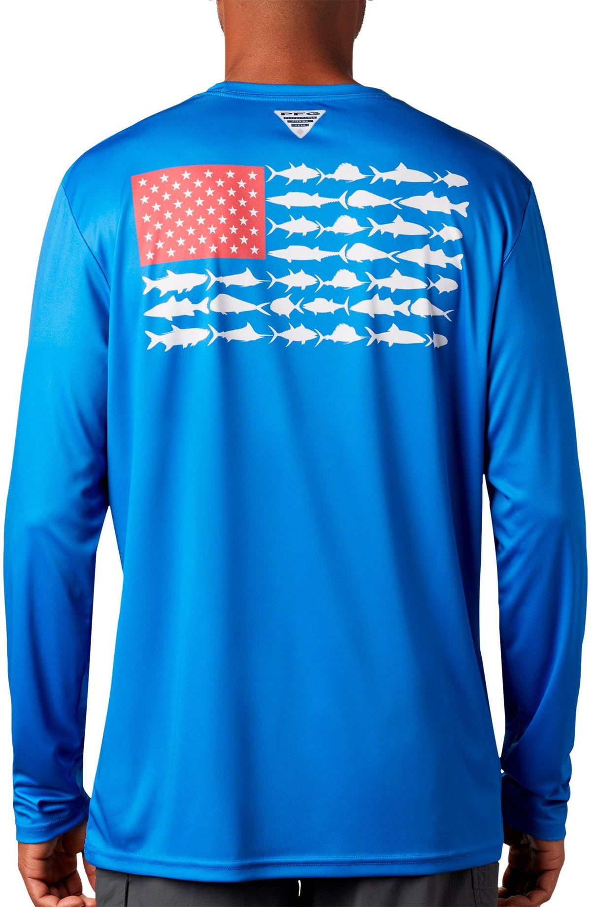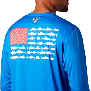 Keep each adventure going strong with this Terminal Tackle PFG T-shirt by Columbia. Stay safe & cool while out on the boat in this stylish long sleeve tee, featuring smooth interlock fabric, Omni-Shade UPF 50 sun protection, Omni-Wick moisture wicking technology to keep you dry, a comfortable crew neckline, Columbia logo on the chest, and American fish flag screen print on the back.
