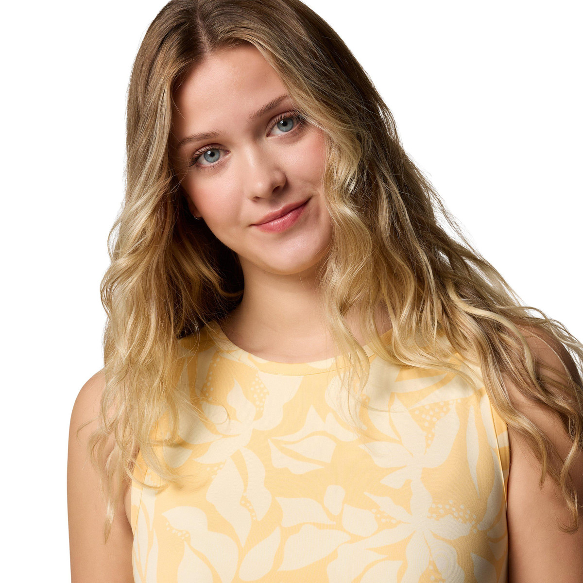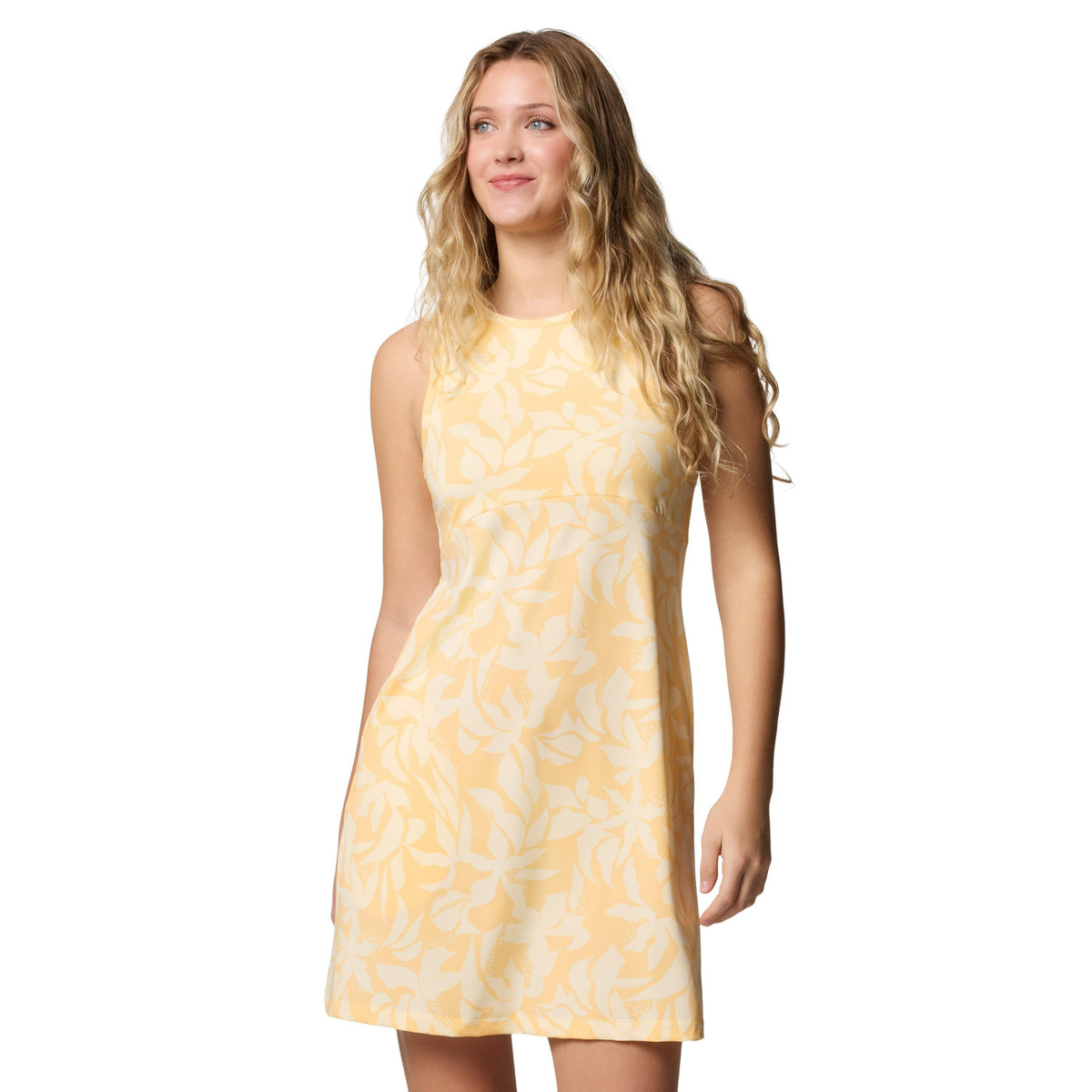 This versatile sleeveless dress features a tropical print design on lightweight stretch, silky-smooth, and lightweight fabric feels to the touch, a round neckline, hand pockets, Omni-Shade UPF 50 sun protection, Omni-Freeze cooling, and moisture-wicking technology. The center back length measures approximately 33 in. Fabrication 89% polyester, 11% elastane.