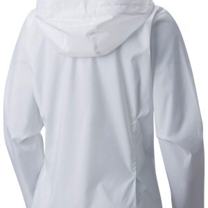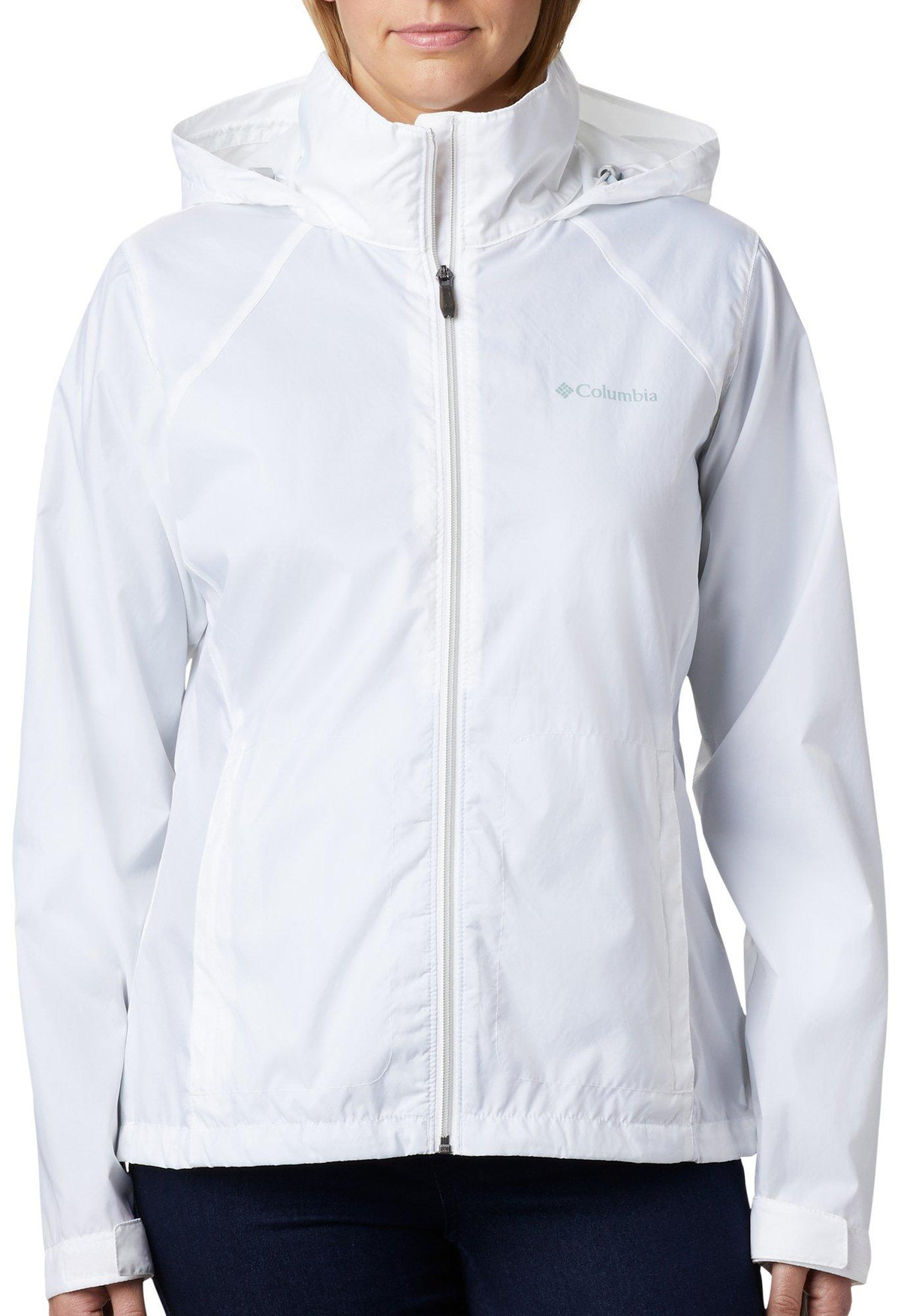 This jacket from Columbia features a solid color design on lightweight waterproof fabric, full front zipper, a stowaway hood, two front zipper pockets, adjustable sleeves, and has warm and wind breaking capabilities and is great for windy cold days. The top length measures approximately 24 in. Fabrication 100% nylon.