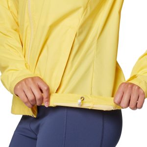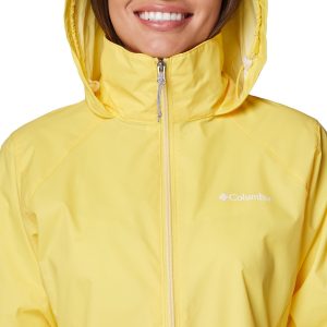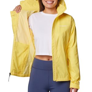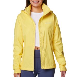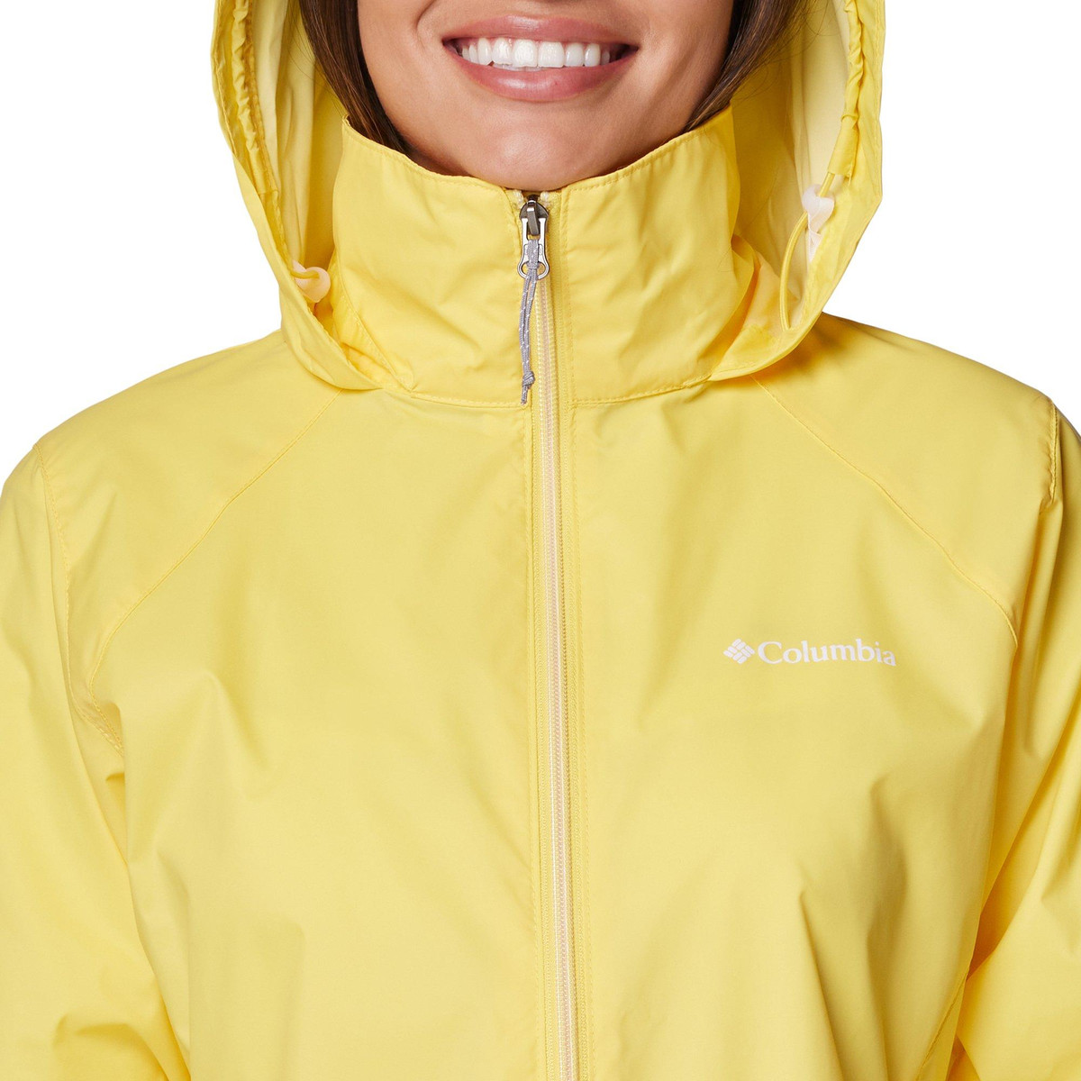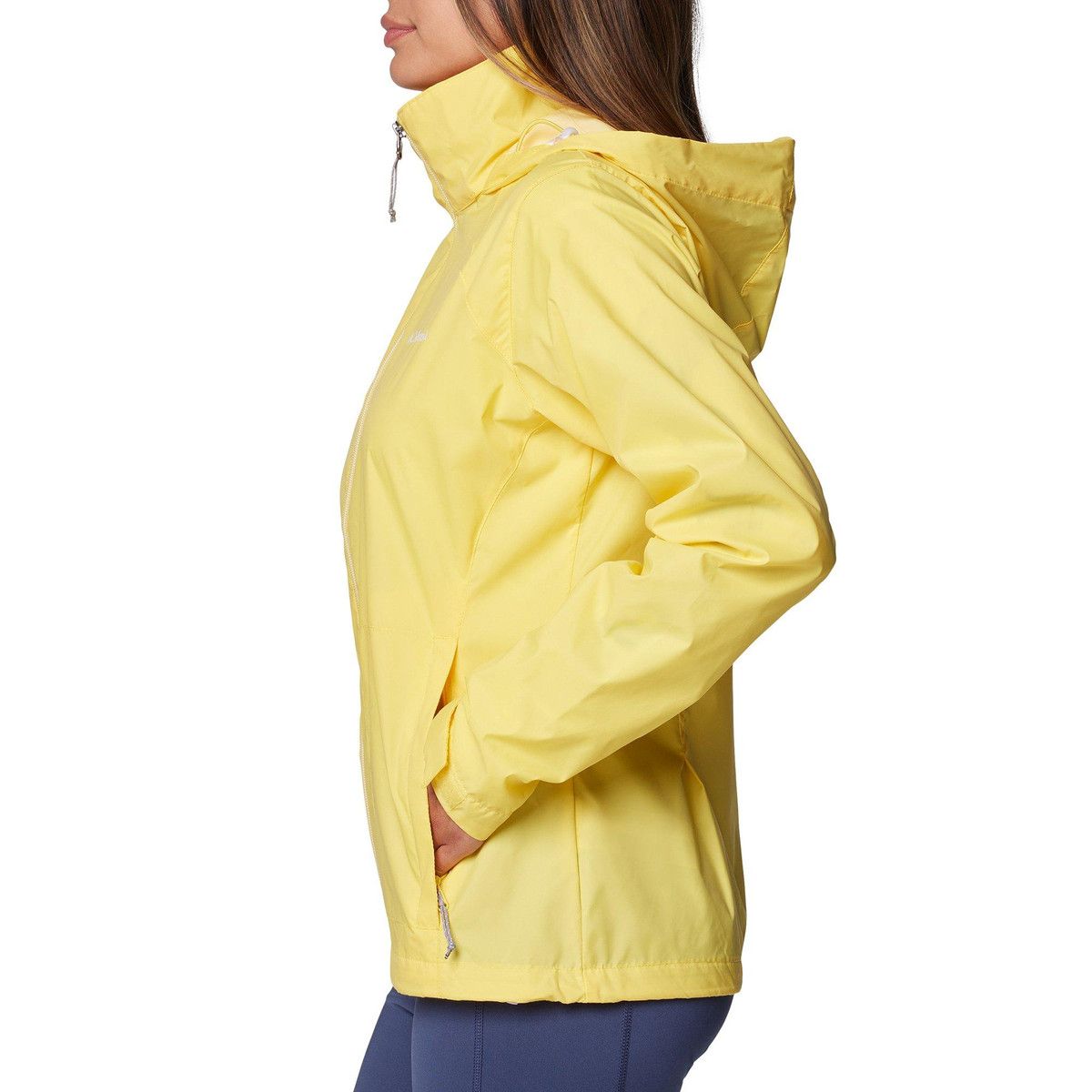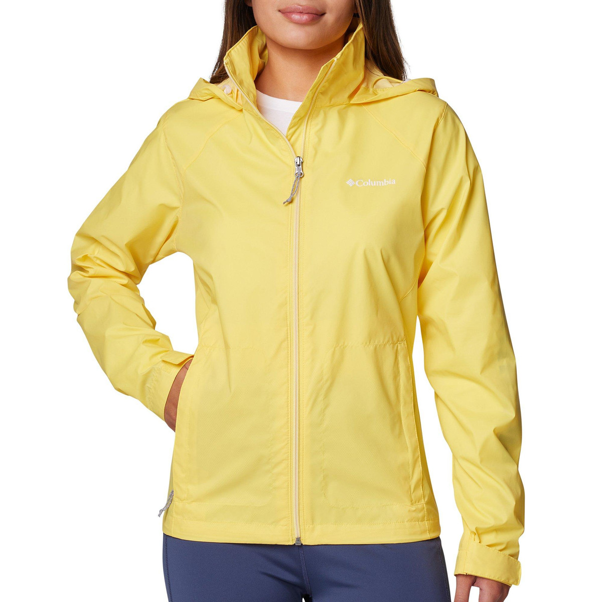 This jacket from Columbia features a solid color design on lightweight waterproof fabric, full front zipper, a stowaway hood, two front zipper pockets, adjustable sleeves, and has warm and wind breaking capabilities and is great for windy cold days. The top length measures approximately 24 in. Fabrication 100% nylon.