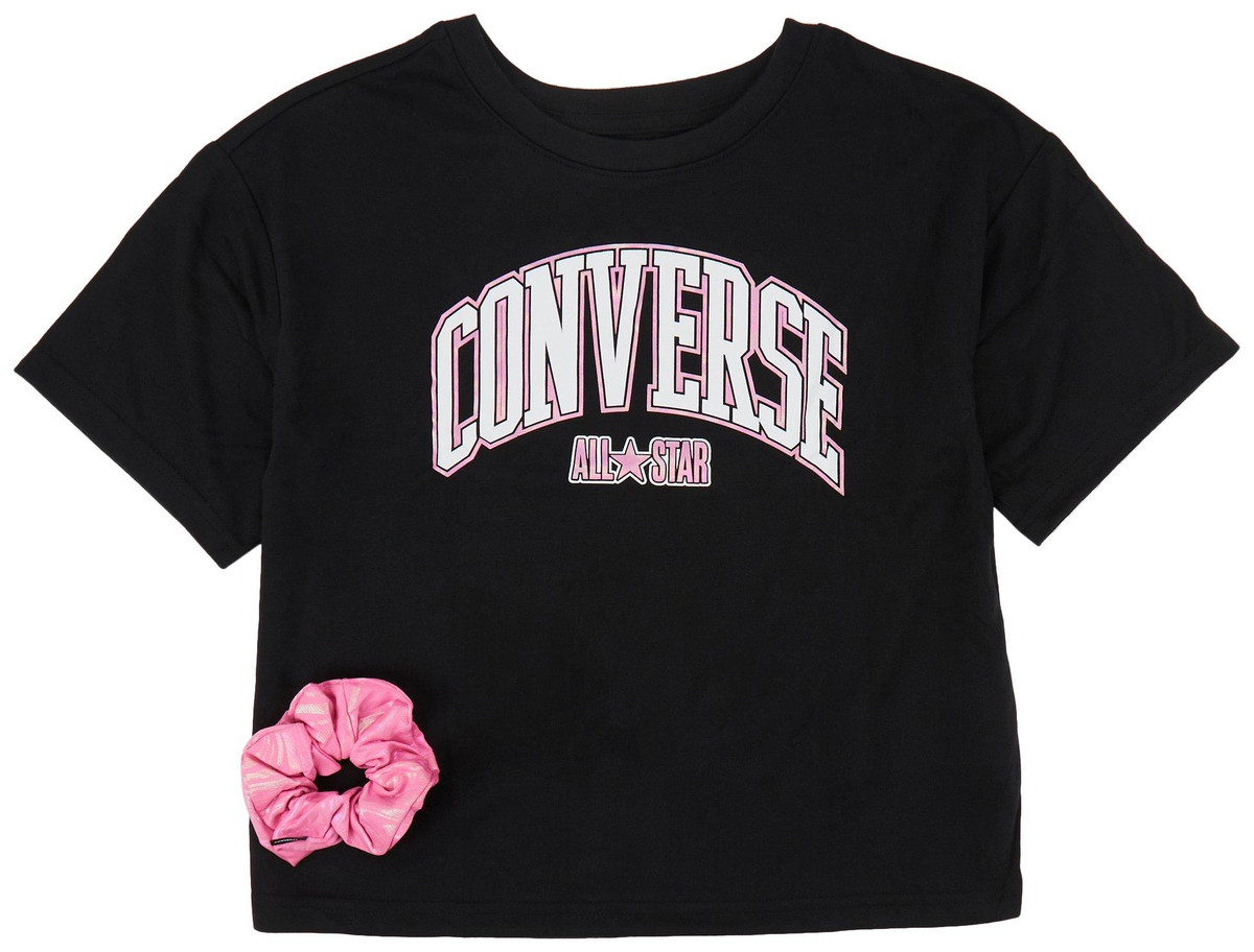 Introducing the Big Girls 2 Pc Logo Tee Set, crafted from 100% polyester for a comfortable and durable wear. This set includes a stylish short sleeve top featuring a brand script on the chest, a classic crew neckline, and short sleeves. Paired with a solid hair scrunchie, it offers a coordinated and trendy look. Perfect for casual outings or everyday wear, this set combines fashion and practicality effortlessly.