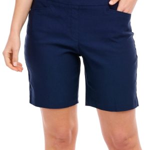 These pull-on shorts feature a solid color design on lightweight stretch knit fabric, an elastic waistband, and two front pockets. Inseam is approximately 10in. Outseam measures approximately 20in. Fabrication 75% rayon, 22% nylon, 3% spandex.
