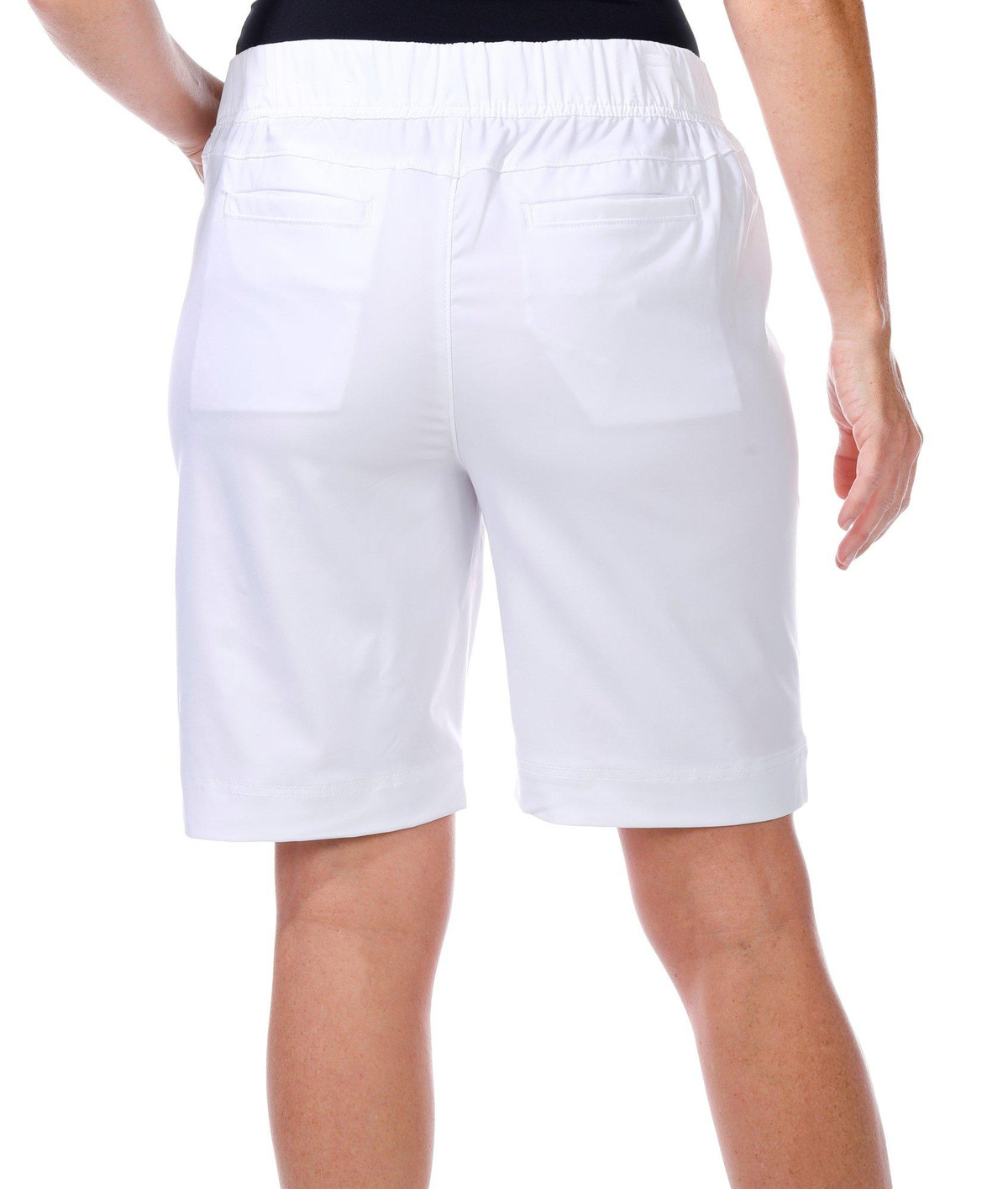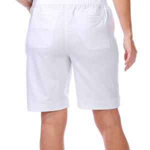 Designed for sunny days, the Petite 9 inch Woven Stretch Bermuda Shorts feature a solid color, button-fly zip closure, and front and back pockets for everyday utility. With a 9-inch inseam, moisture-wicking, quick-dry fabric, and UPF 50+ protection, they offer comfort, coverage, and performance in one sleek fit. Fabrication 90% polyester, 10% spandex