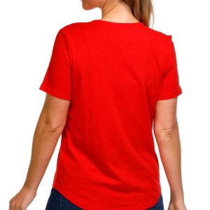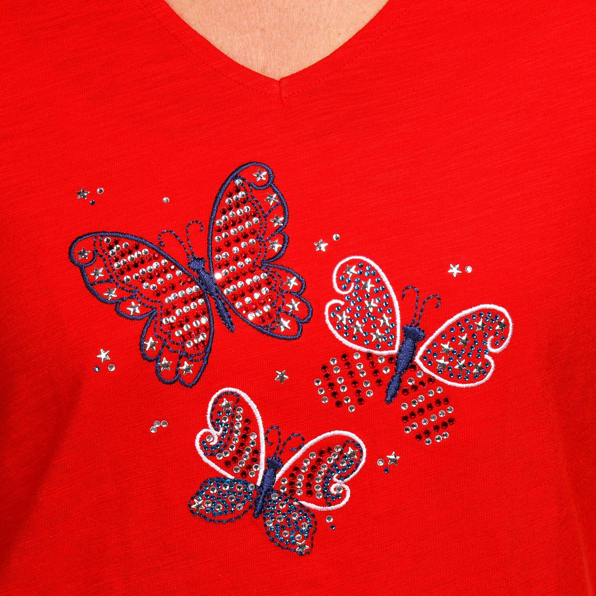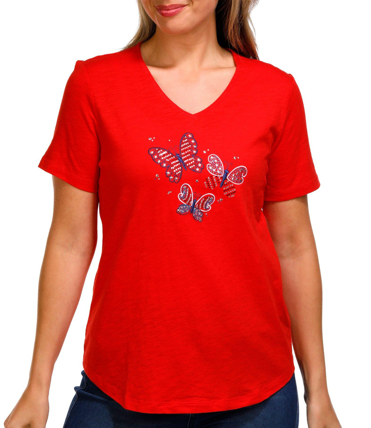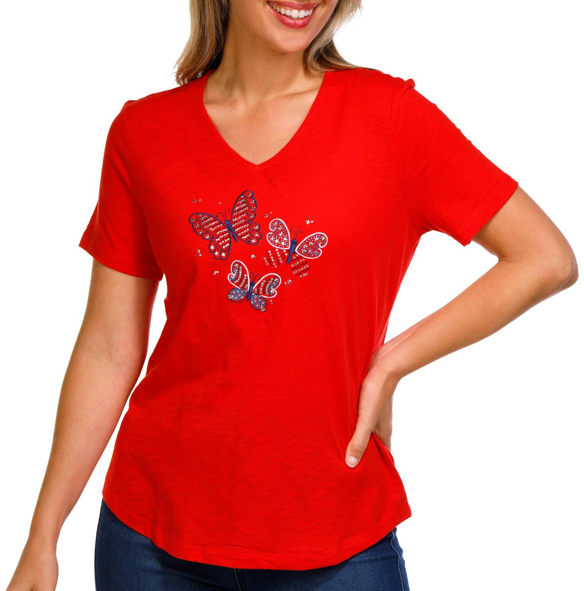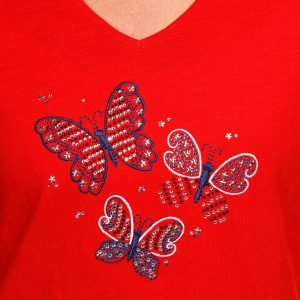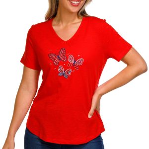 Celebrate in style with this Petite Americana Butterfly Top. Made from 100% cotton, it features a dazzling rhinestone-embellished butterfly in patriotic colors, a flattering V-neckline, and short sleeves.