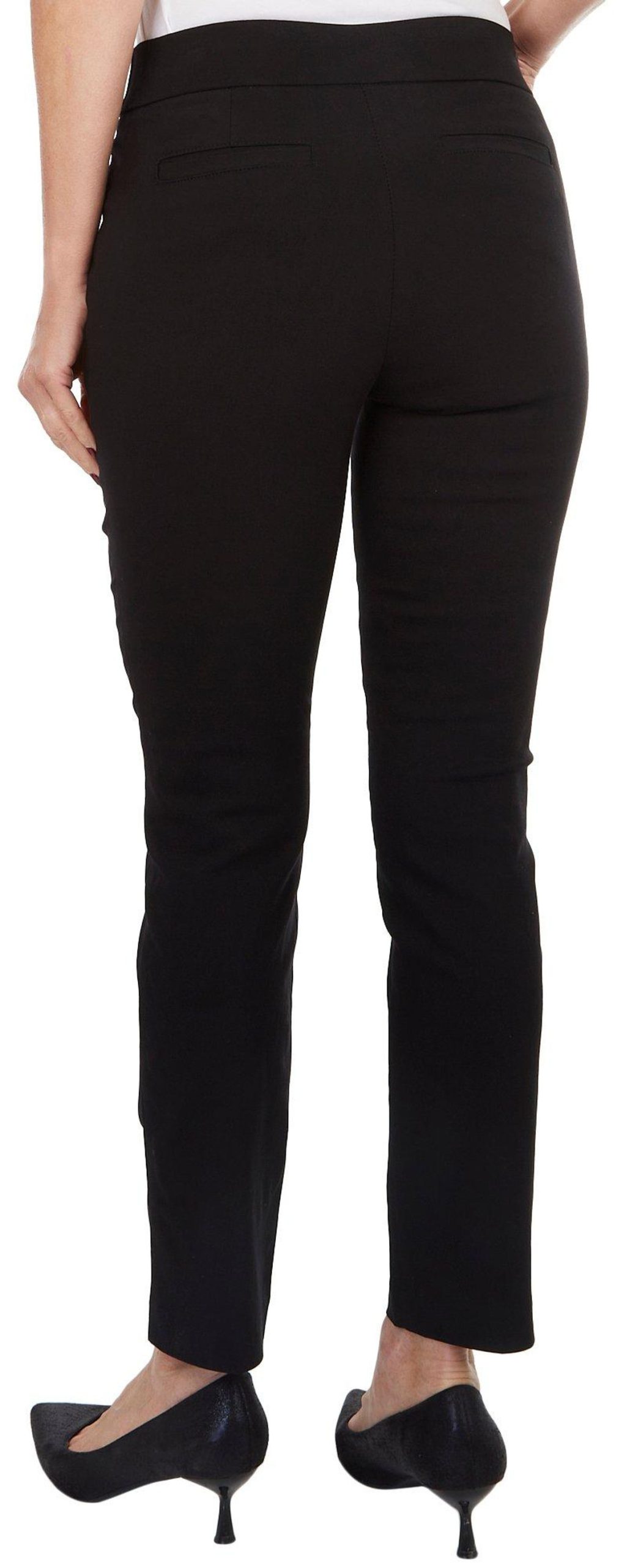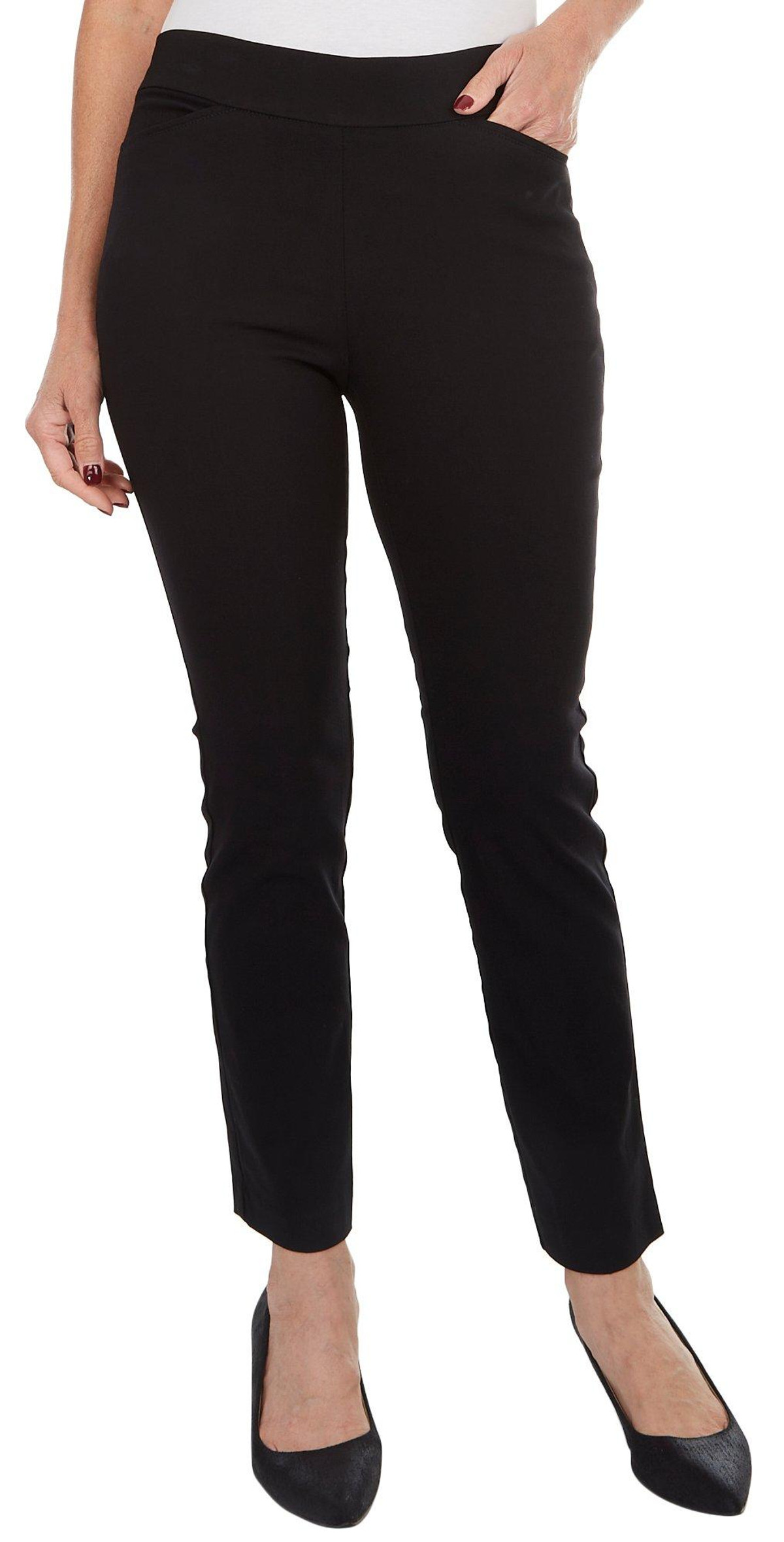 These pull-on pants feature a solid design on comfort stretch fabric, a hidden elastic waist, slimming tummy panel, two front slip pockets, two rear pockets, and a classic fit. Inseam measures approximately 28 inches in length. Fabrication 75% rayon, 22% nylon, 3% spandex.