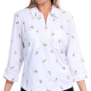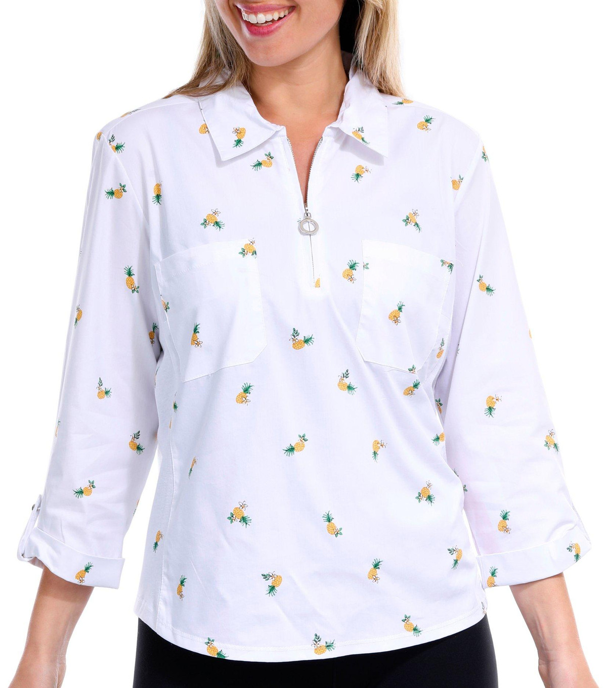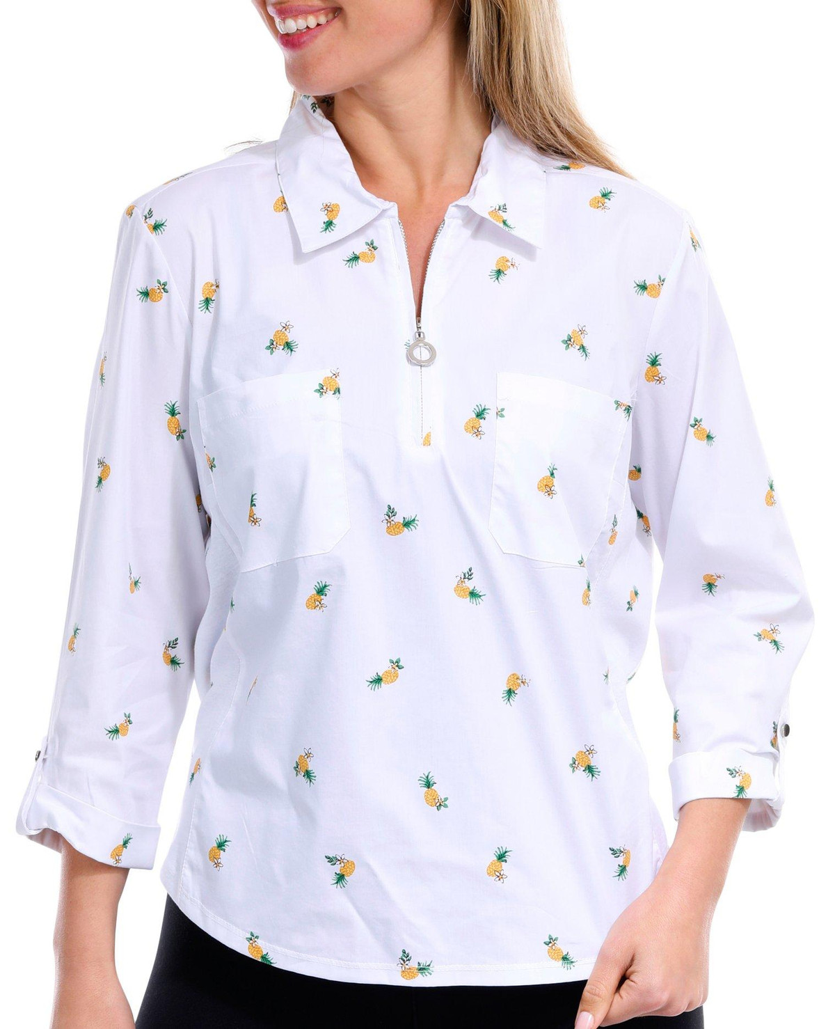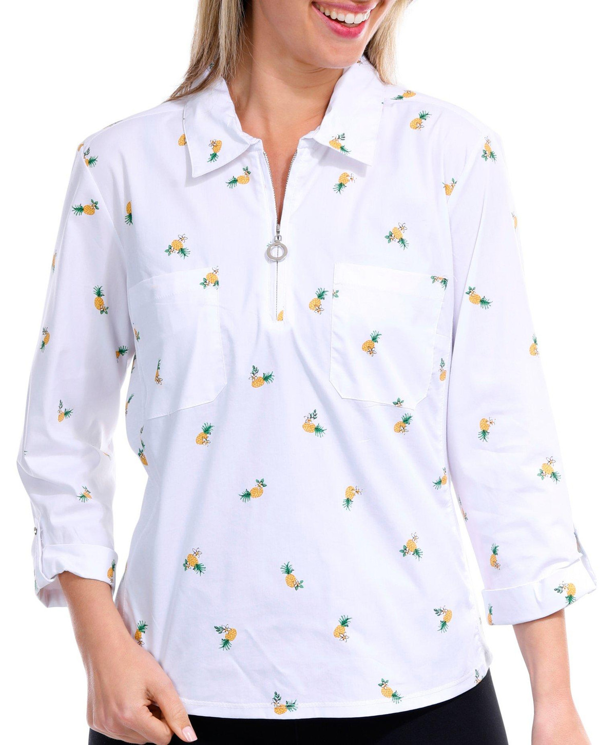 Add some flair to your wardrobe with this Petite Printed Zip Front 3/4 Sleeve Top! Featuring a chic 1/4 zip-up collared neckline, functional chest slip pockets, and a sleek printed design, it’s perfect for both style and convenience. Made from 67% cotton, 29% polyester, and 4% spandex, it offers a comfortable, stretchy fit that’s perfect for everyday wear.