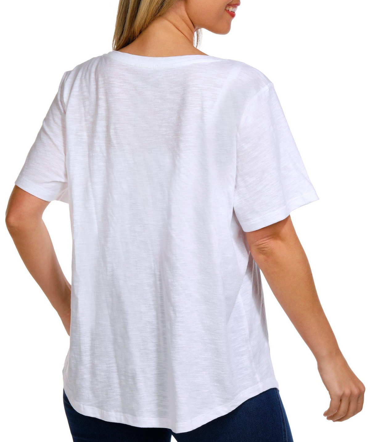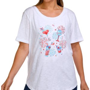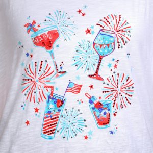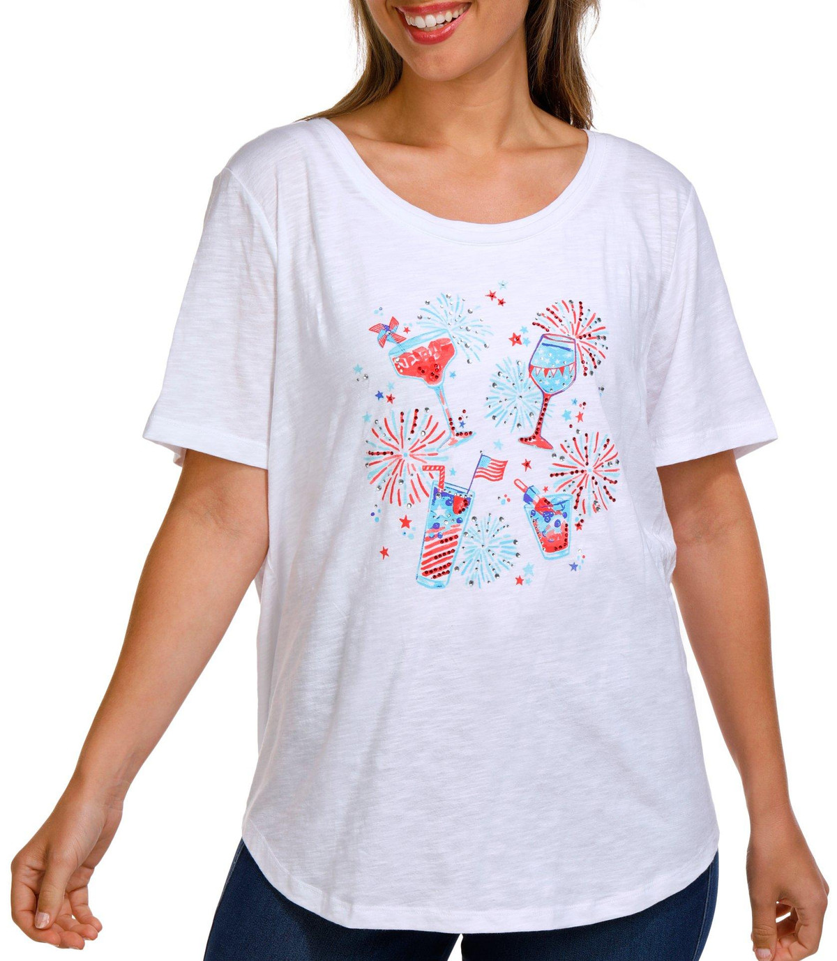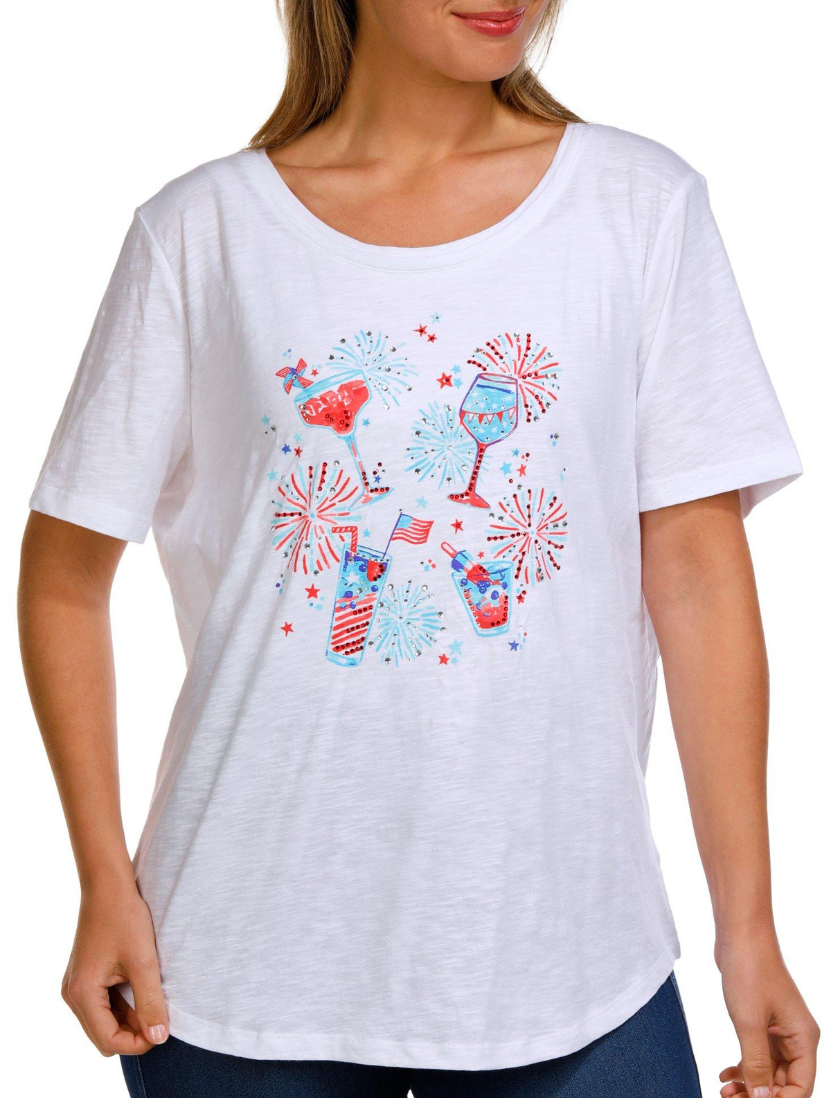 Cheers to festive style with this Petite Scoop Neck Americana Cocktail Top. Made from 100% cotton, it features a fun, rhinestone-embellished cocktail graphic with Americana flair, a scoop neckline, and short sleeves.