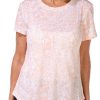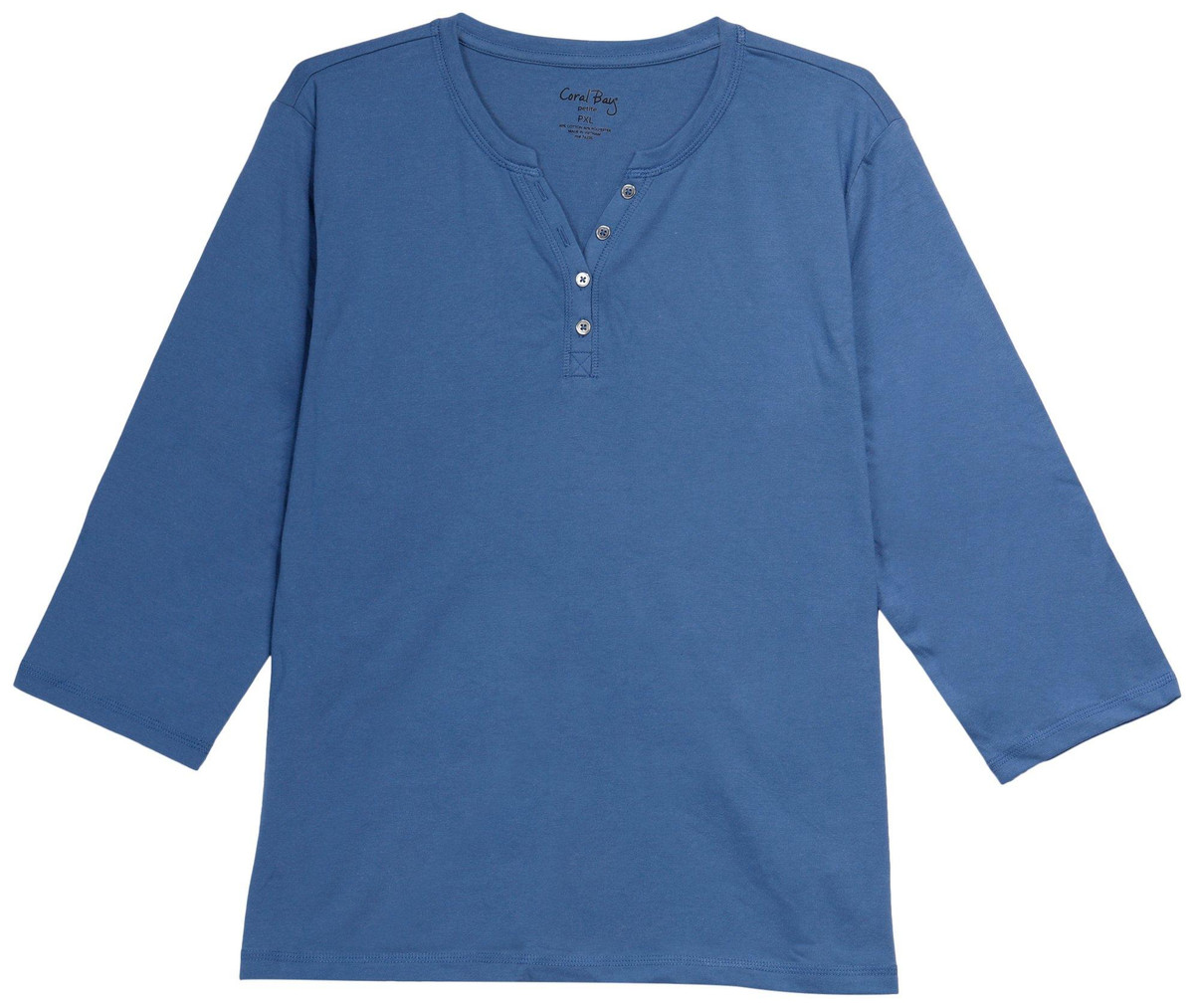 This ¾ sleeve top features a solid color on lightweight fabric, four-button placket, and a straight hemline. The top length measures approximately 25 in. Fabrication is 60% cotton and 40% polyester.