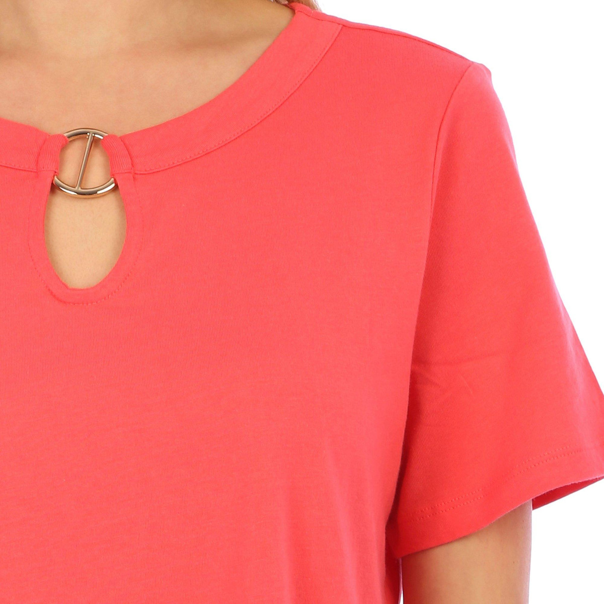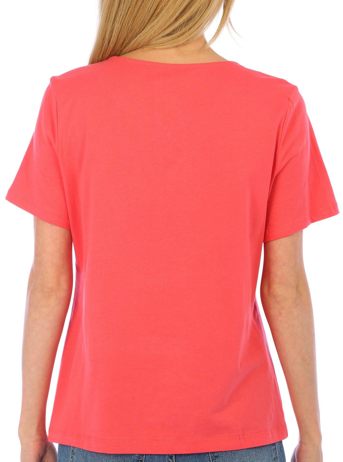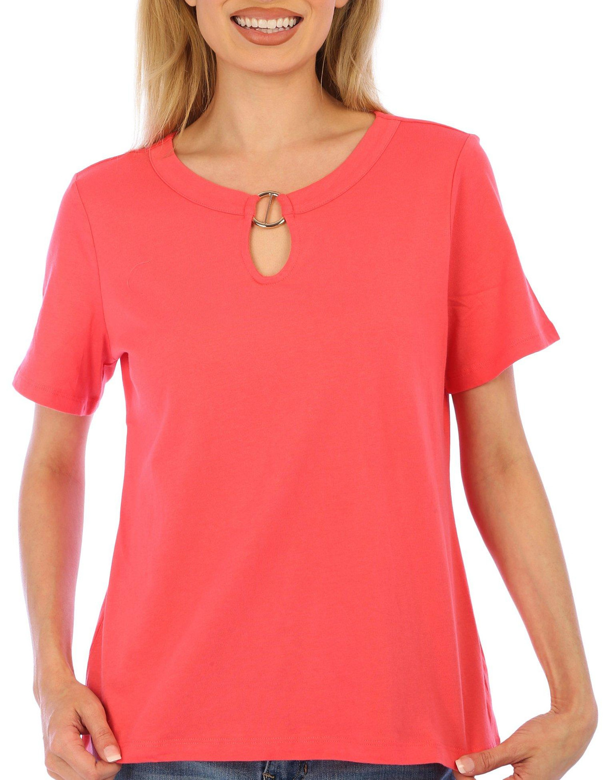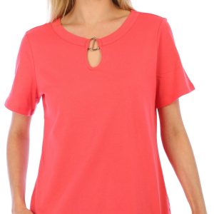 Elevate your everyday style with our Short Sleeve Top! This versatile piece features a solid color design, perfect for mixing and matching with your favorite wardrobe staples. Made from soft cotton, it offers a comfortable and breathable fit for all-day wear. The split neckline with metal ring detail adds a touch of modern flair, making this top a standout addition to your collection. Top length measures approximately 23 in.