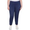 These plus size capris feature a solid color with a pull on waistband for easy wear. Front pockets add function while floral shaped grommets at the hem bring a stylish touch. The 21 inch inseam offers a flattering cropped fit. Fabrication 75% nylon, 22% nylon, 3% spandex