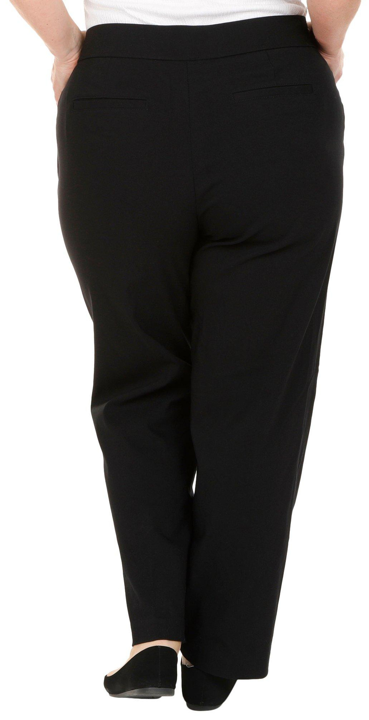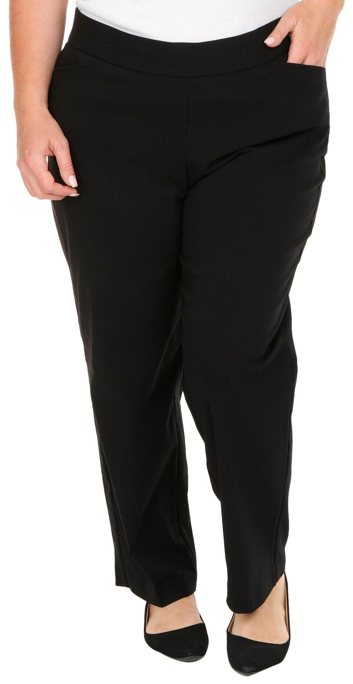 These pull-on pants feature a solid design on lightweight comfort stretch fabric, a hidden elastic waistband for optimal comfort, a slimming tummy panel, two front pockets, two back pockets, and slim fit. Inseam measures approximately 28 inches. Fabrication 75% rayon, 22% nylon, 3% spandex.