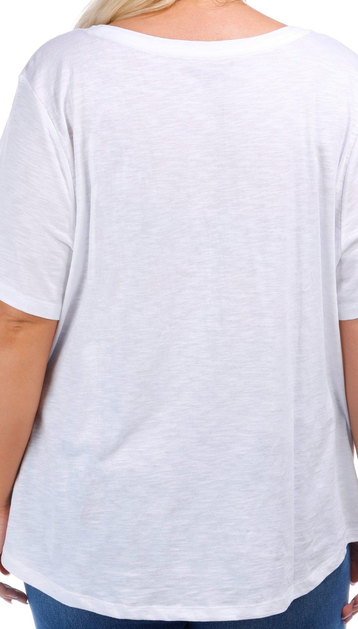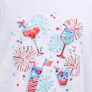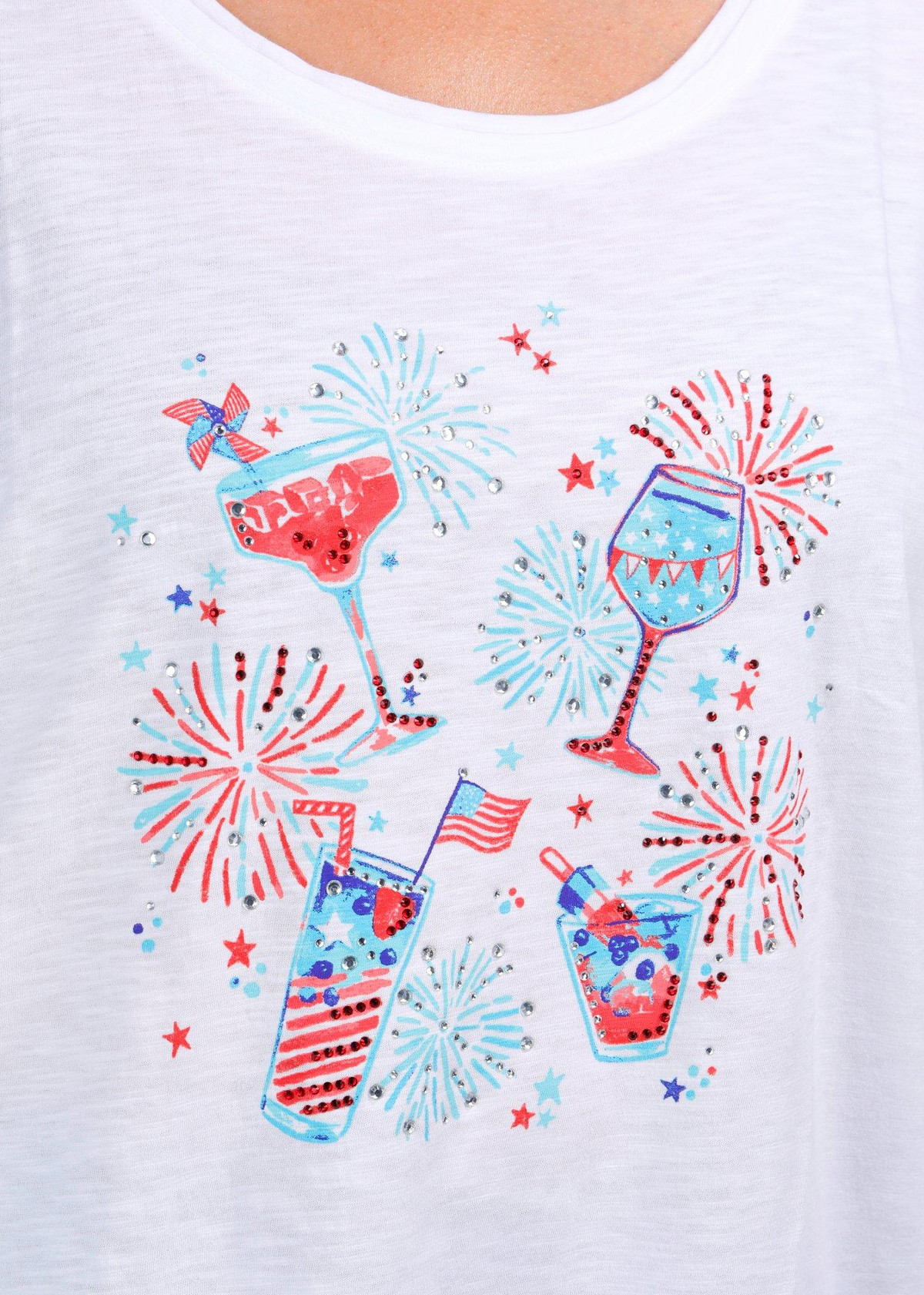 Show your patriotic flair with this Plus Embellished Short Sleeve T-Shirt. Crafted from a soft cotton, it features red, white and blue drink glasses adorned with sparkling rhinestones. The short sleeves and flattering double scoop neckline add comfort and style, perfect for festive summer days. Fabrication is 100% Cotton. Top length measures approximately 29 in.