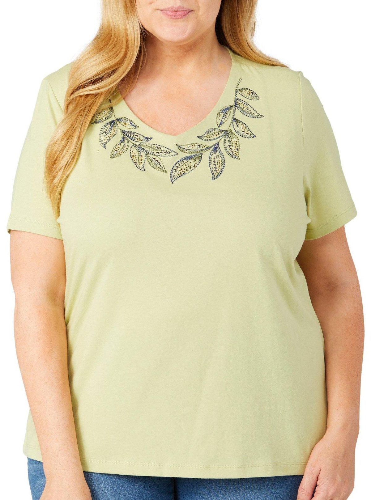Add a touch of glamour to your wardrobe with the Plus Embellished Short Sleeve Top, designed for both comfort and style. Made from a blend of 60% cotton and 40% polyester, this top offers a lightweight, breathable feel with lasting durability. The exquisite embellishments elevate the design, adding a hint of sparkle and sophistication.
