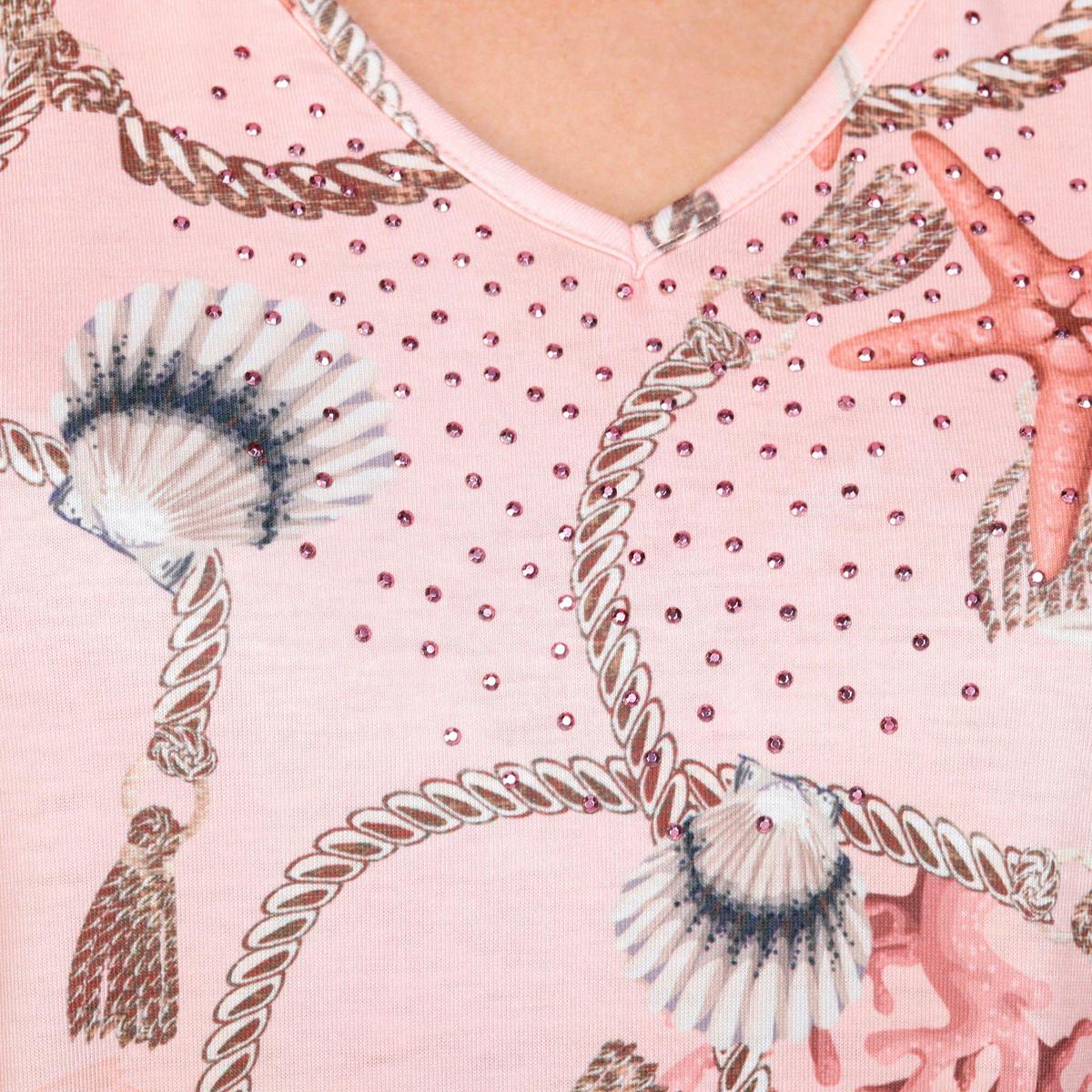 This plus size swing dress features short sleeves, a v-neckline and a starfish graphic with rhinestone accents. Made from soft fabric, it offers a relaxed fit perfect for lounging, sleepwear, or casual activities. Fabrication 95% polyester, 5% spandex