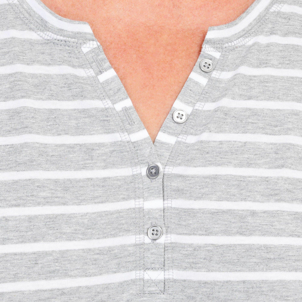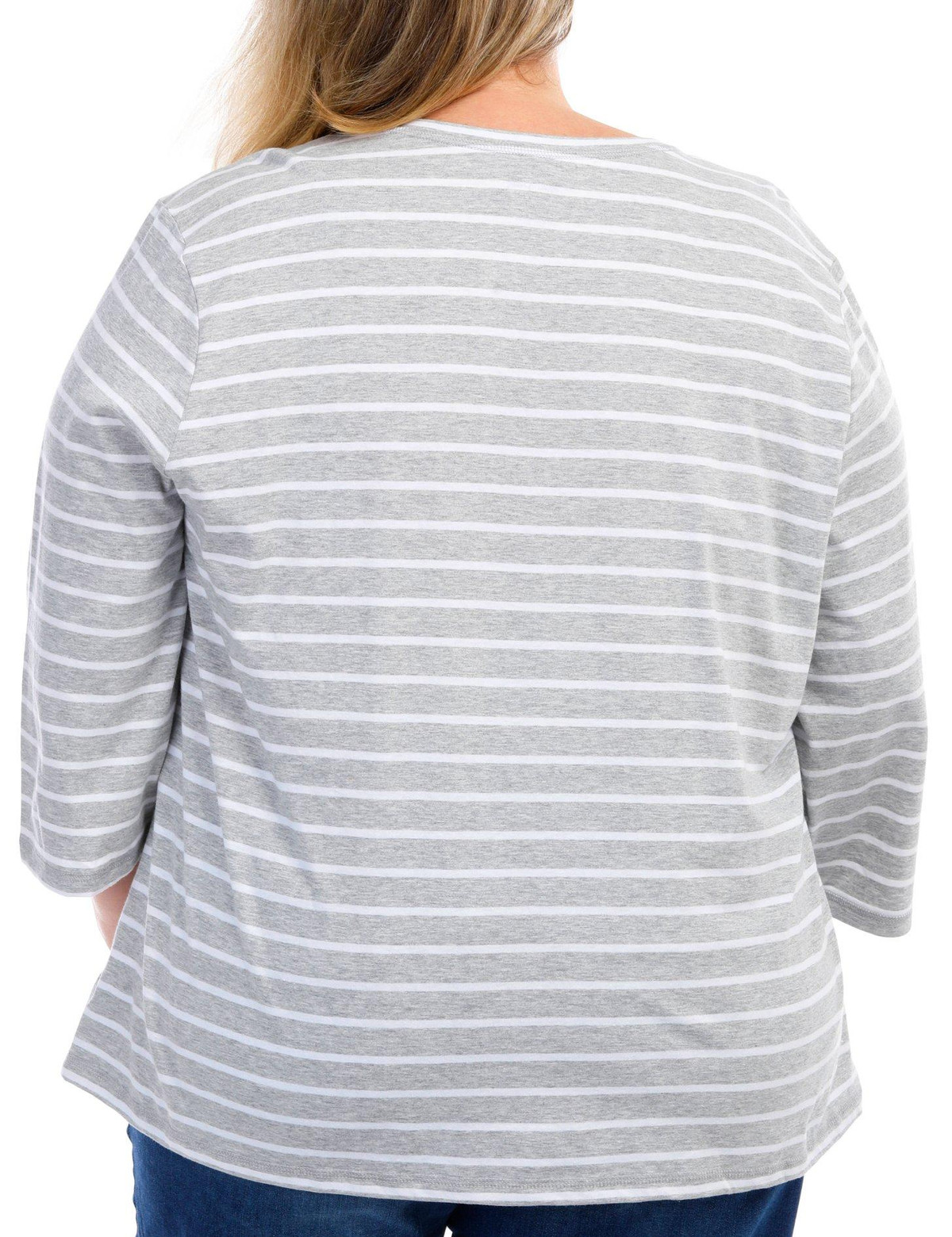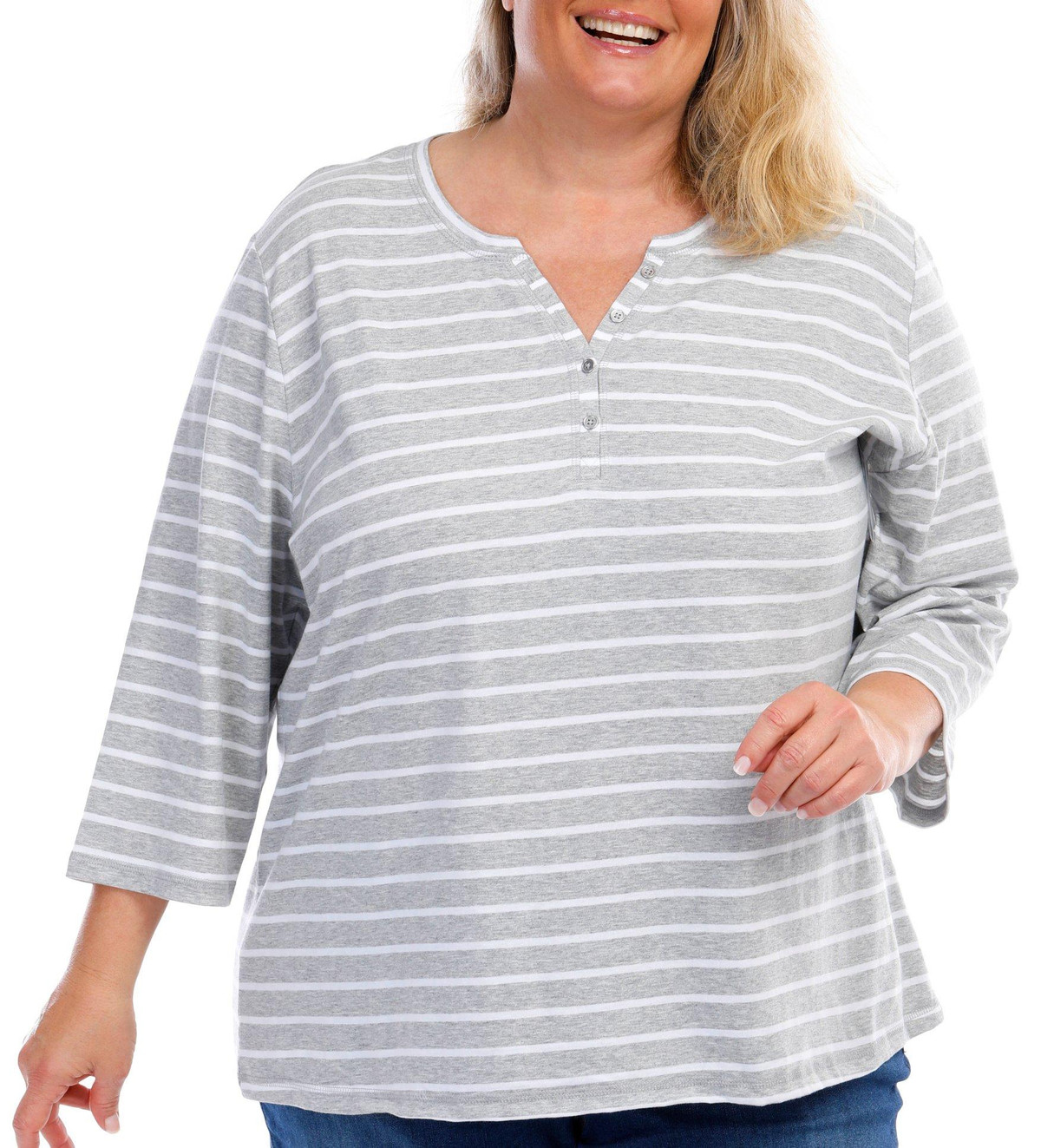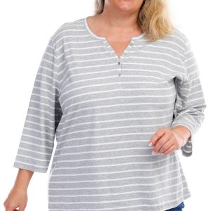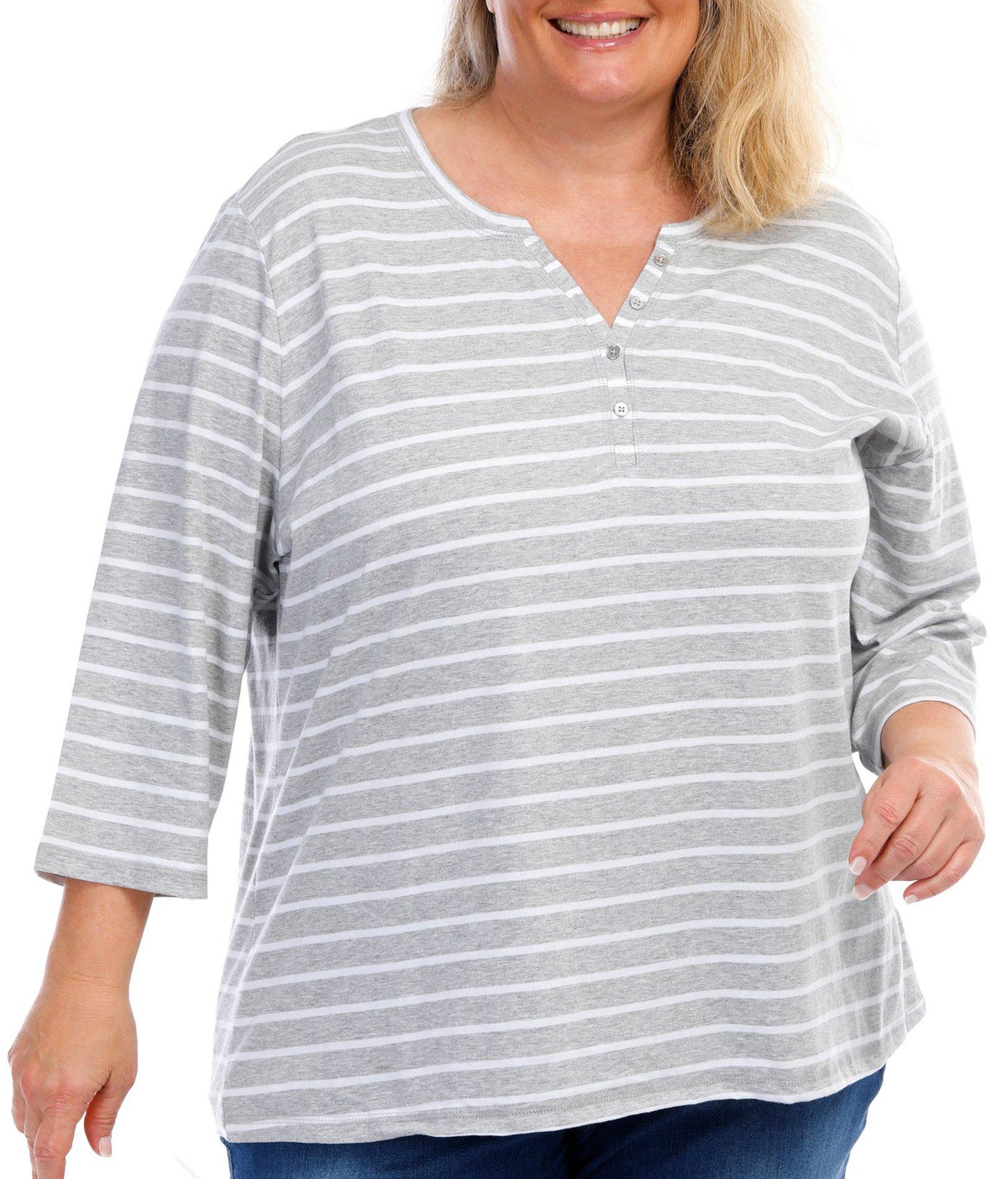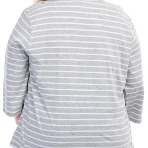 This ¾ sleeve top features a stripe pattern on lightweight fabric, four-button placket, and a straight hemline. The top length measures approximately 26 in. Fabrication is 60% cotton and 40% polyester.