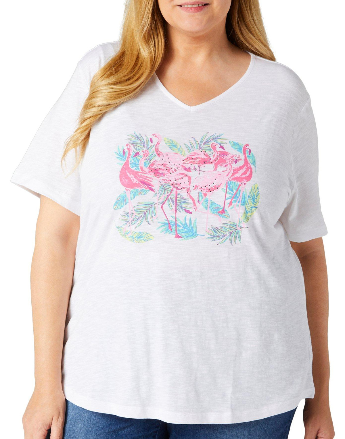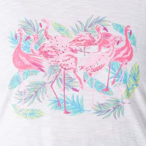 Step into summer with our Petite V-Neck Flamingo & Fronds Top. Made from 100% cotton, this top offers both comfort and breathability. The vibrant flamingo and palm frond graphic design, adorned with rhinestone embellishments, adds a playful and stylish touch. The v-neckline and short sleeves provide a flattering fit, while the 25-inch length ensures versatility for any casual outing. Perfect for adding a tropical flair to your wardrobe.
