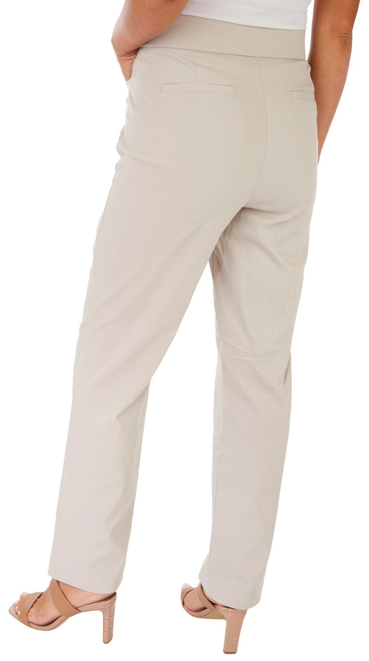 These pull-on pants feature a solid design on lightweight comfort stretch fabric, a hidden elastic waistband for optimal comfort, a slimming tummy panel, two front pockets, two back pockets, and slim fit. Inseam measures approximately 30 inches. Fabrication 75% rayon, 22% nylon, 3% spandex.