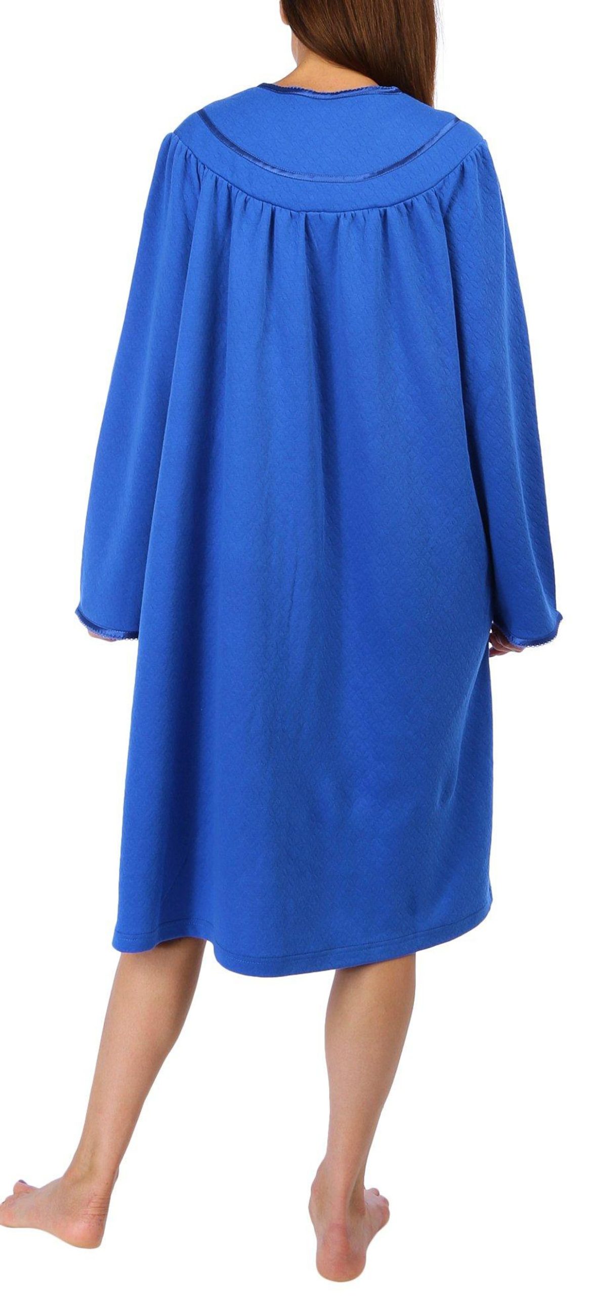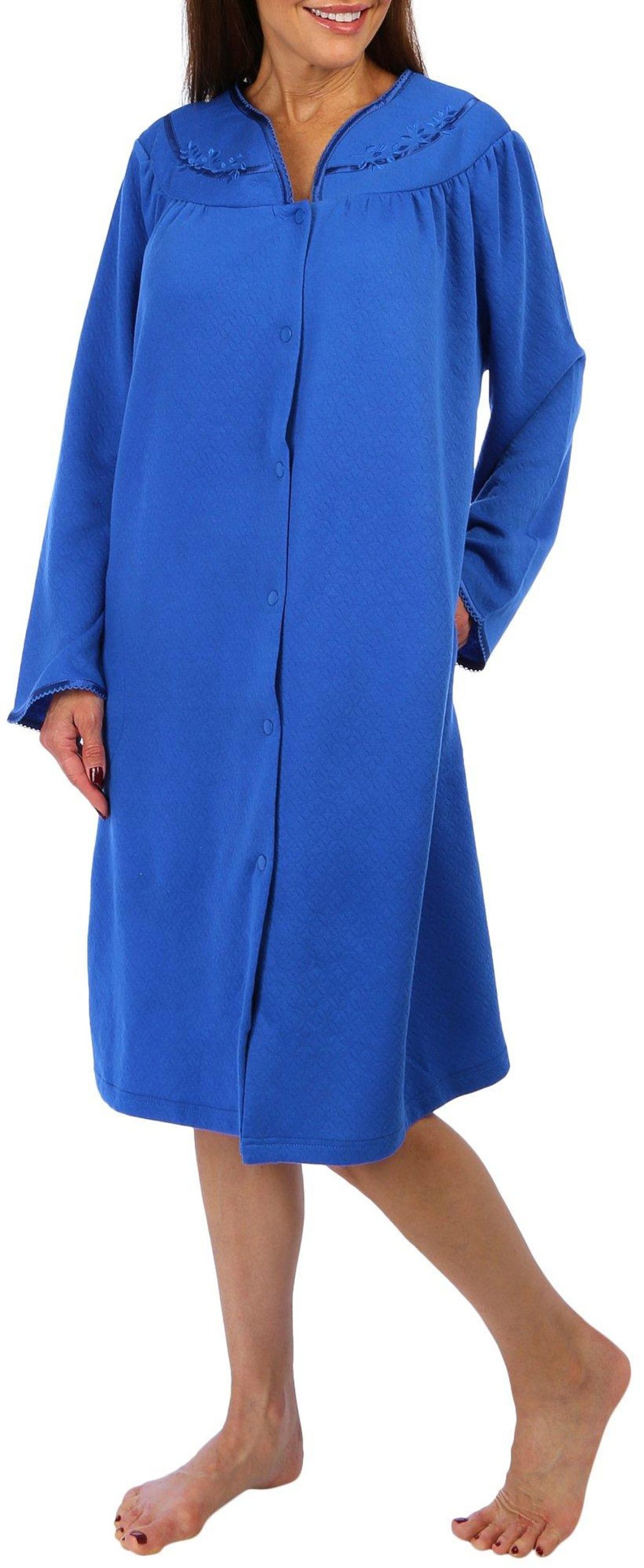 Wrap yourself in luxury with our Quilted Buttoned Bath Robe. Featuring elegant quilted-style embroidery, this robe combines sophistication with comfort. The snap-buttoned front ensures a secure fit, while the two front pockets add practicality and convenience. Perfect for lounging at home or stepping out of the bath, this robe offers a cozy embrace that makes every moment feel indulgent. Measures approximately 42 in. from shoulder to hem.