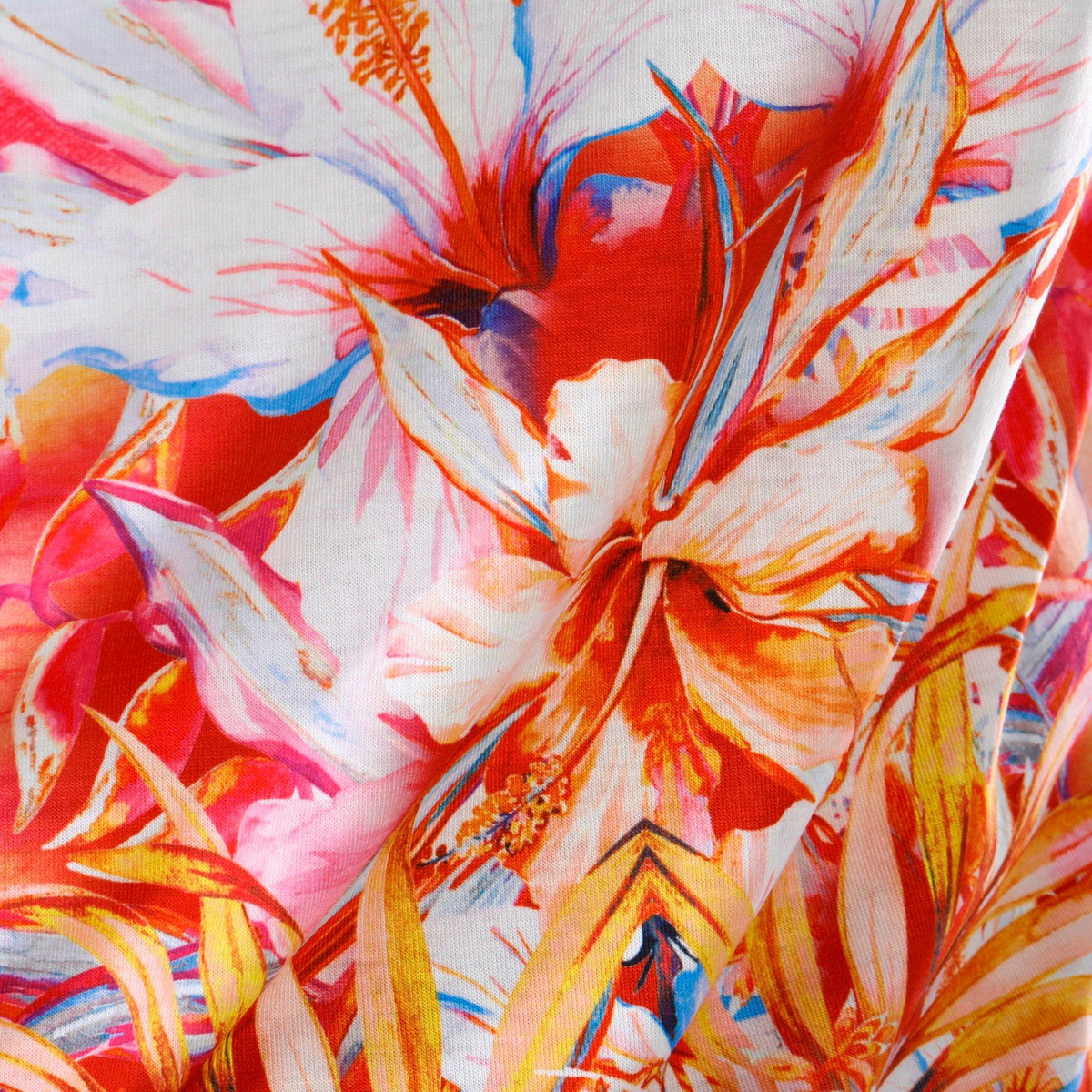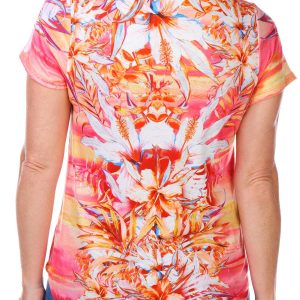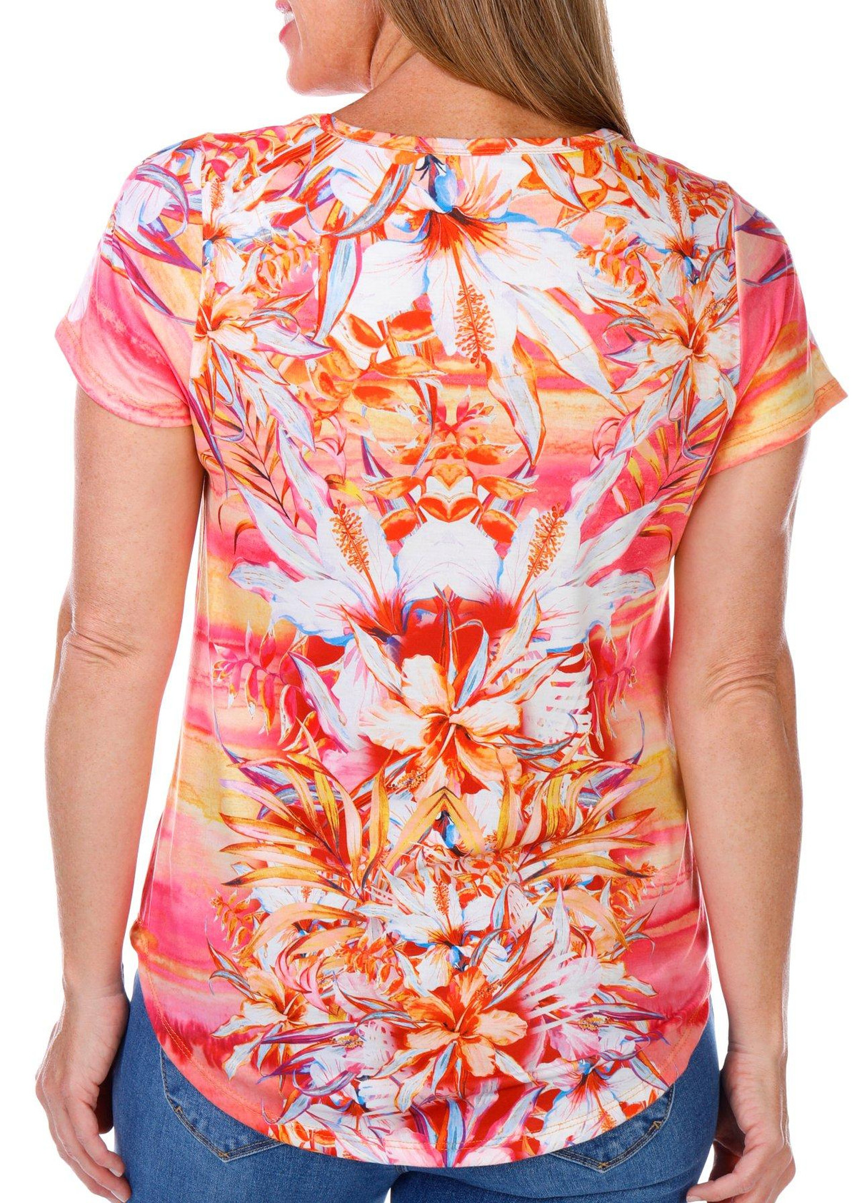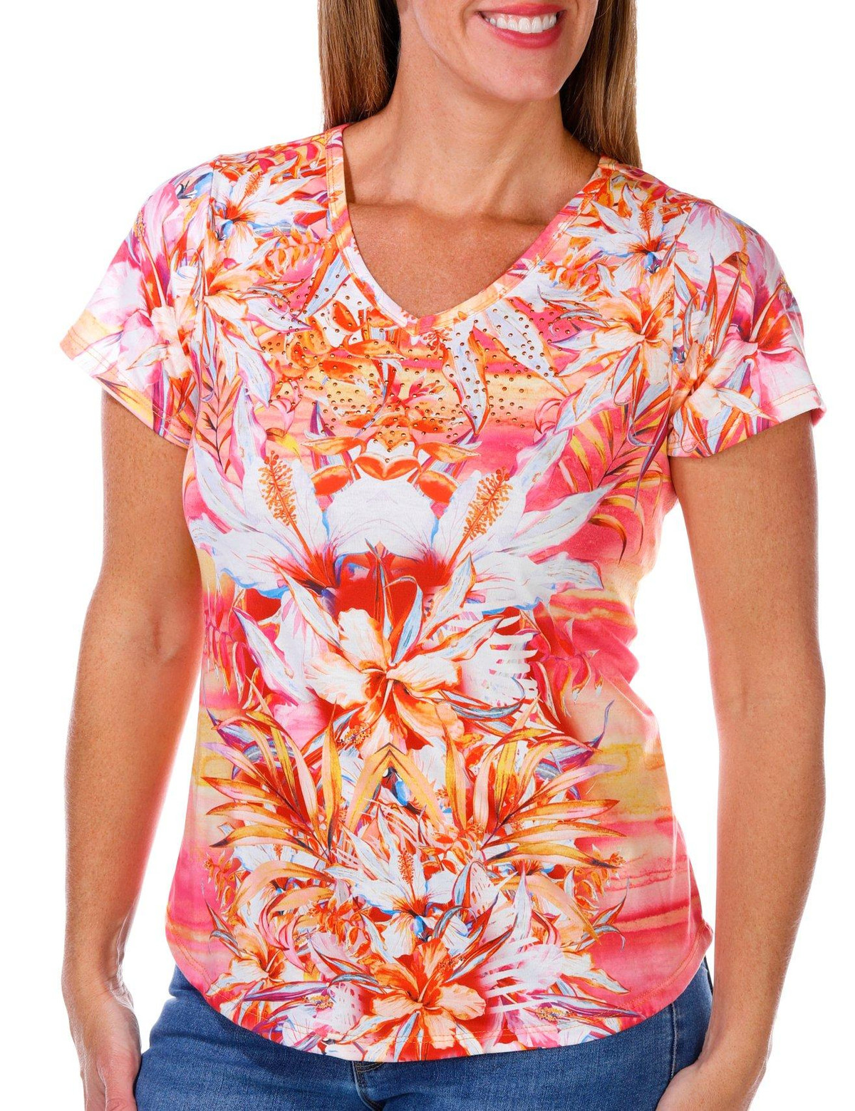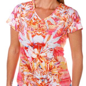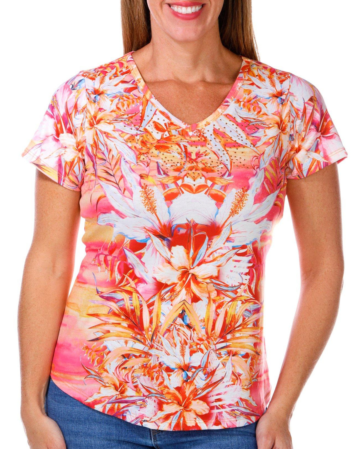 Brighten your wardrobe with the Women’s Short Sleeve Tropical Floral V-neck Top. Featuring a vibrant tropical floral print, flattering V-neckline, and sparkling rhinestone embellishments, this breezy short-sleeve top adds a touch of glam to your everyday look. Fabrication 95% polyester, 5% spandex