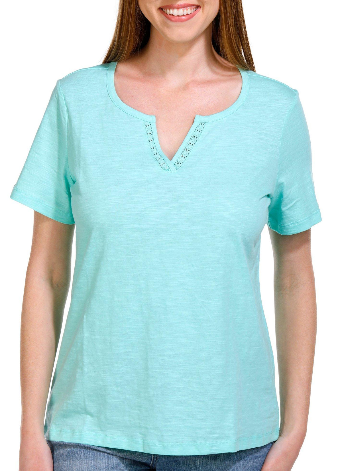Add a touch of elegance to your wardrobe with this Women’s Solid Crochet Split Neck Short Sleeve Top. Made from 100% soft and breathable cotton, this top ensures comfort while keeping you stylish. Featuring a delicate crochet design at the split neckline, it strikes the perfect balance between casual and refined.