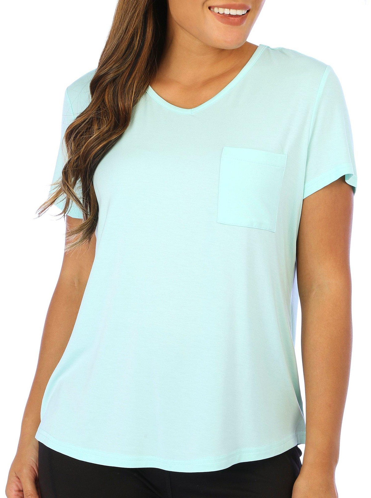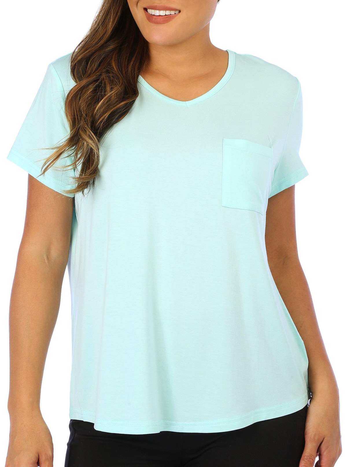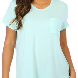 Enjoy a restful night with our Solid V-Neck Sleep Tee. This classic tee features a convenient chest pocket, adding a touch of practicality to your sleepwear. Made from soft, breathable fabric, it ensures maximum comfort throughout the night. The simple yet stylish design makes it a versatile addition to your loungewear collection. The top length measures approximately 25 in. Fabrication 93% modal and 7% spandex.