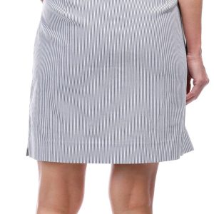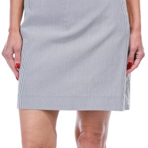 This pull-on skort features a stripe print design on lightweight comfort stretch fabric, hidden elastic waistband, two front slip pockets, built-in shorts, and a classic fit. Skirt measures approximately 18 in length from waistband to hemline. Inseam measures approximately 4 in. Fabrication 75% rayon, 22% nylon, 3% spandex.