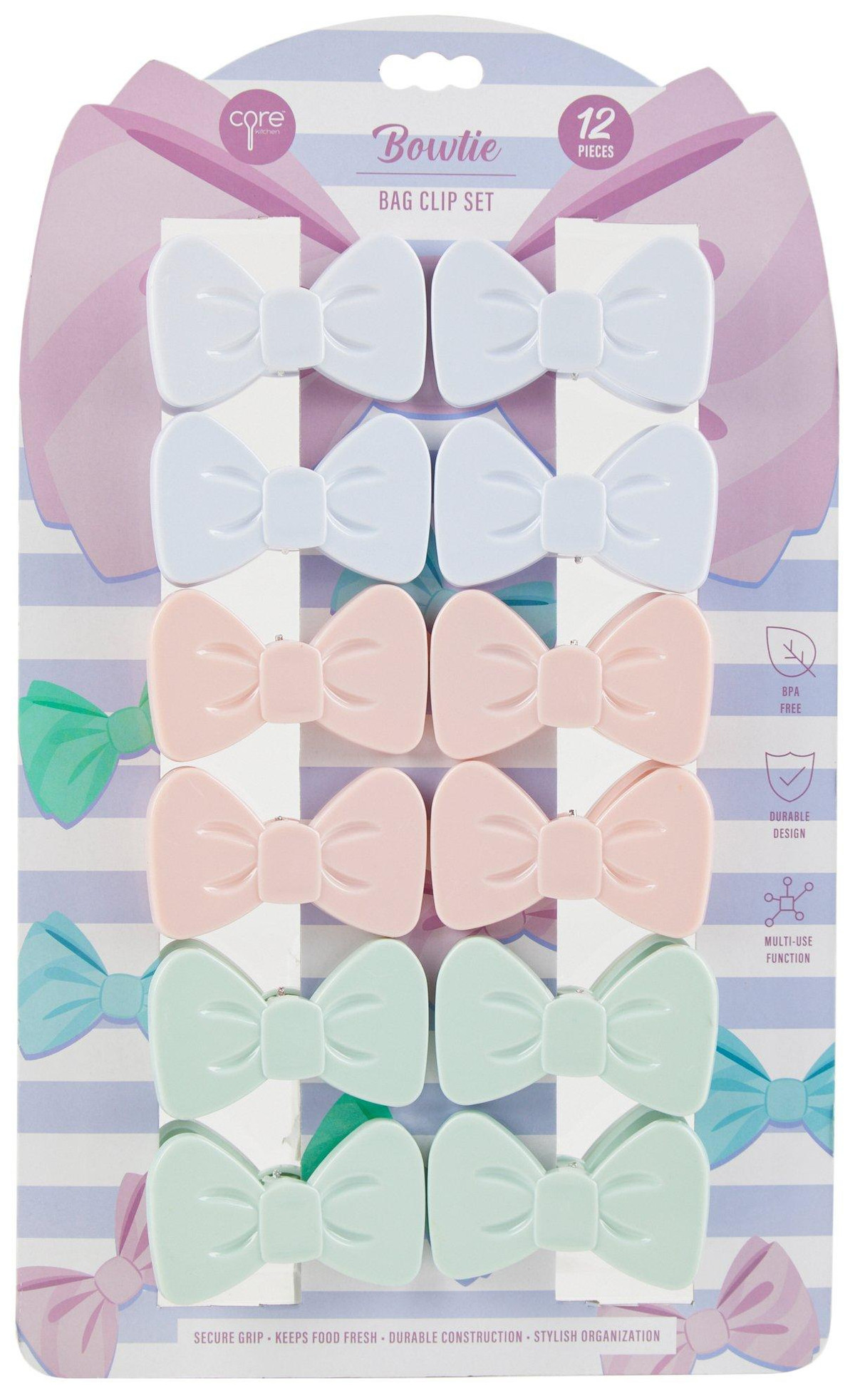 Keep snacks fresh in style with this 12-pack Bowtie Bag Clip Set. Each clip features a secure grip, durable construction, and a charming bow shape that adds a playful touch to your kitchen. Perfect for sealing bags and decorating your pantry or fridge with a hint of whimsy. Can also be used to organize your photos, notes, papers or receipts.