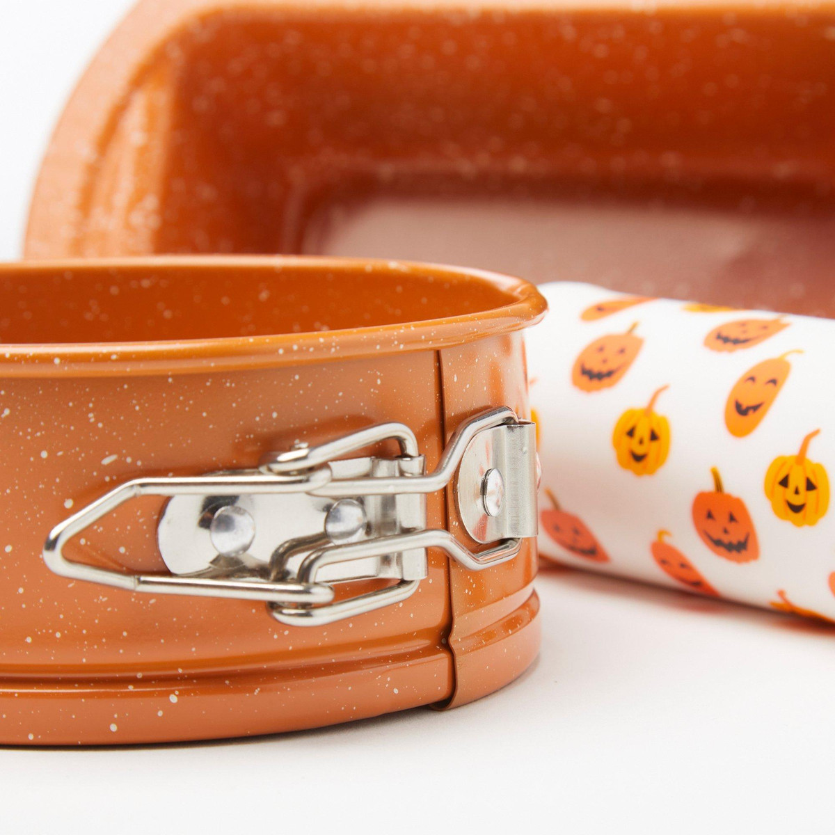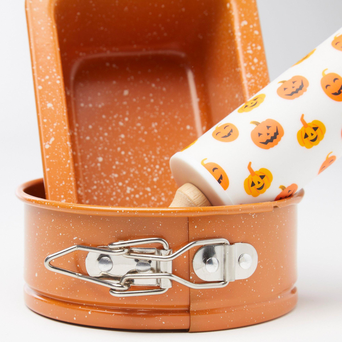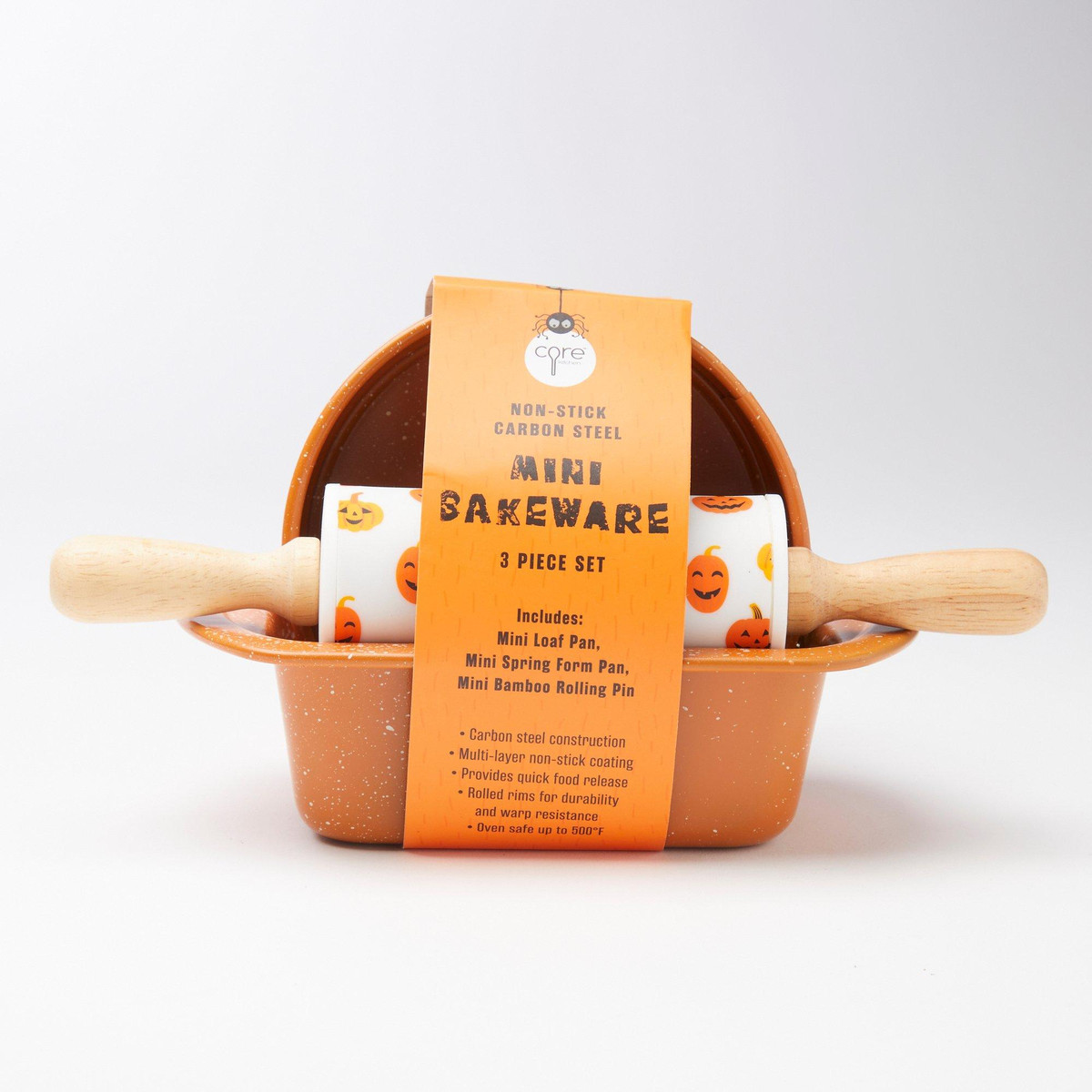 Celebrate Halloween in the kitchen with this festive 3-piece mini bake set! Includes a non-stick carbon steel orange mini loaf pan, orange mini springform pan, and a bamboo rolling pin decorated with cute pumpkin designs. Perfect for baking small seasonal treats with spooky style.