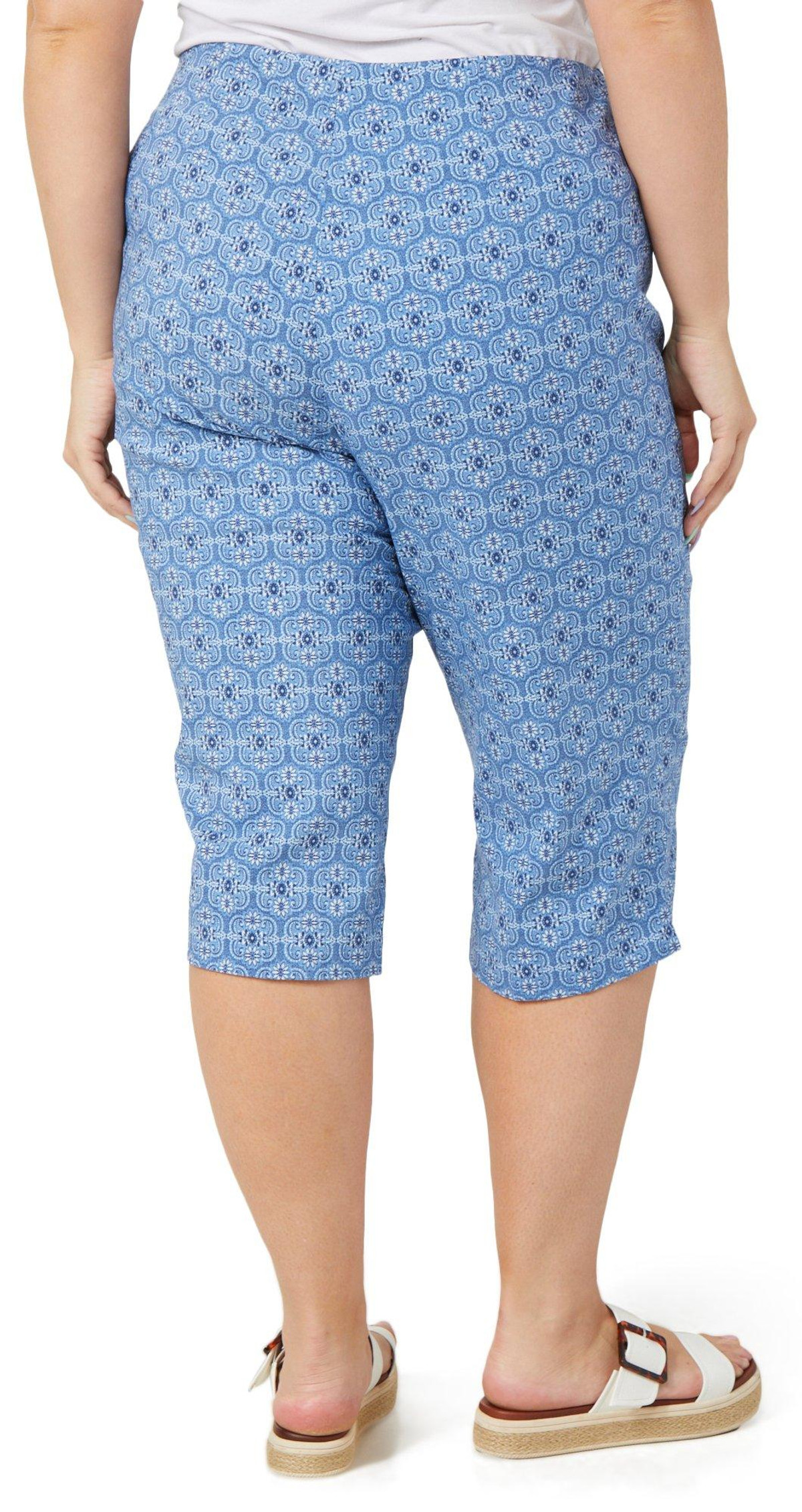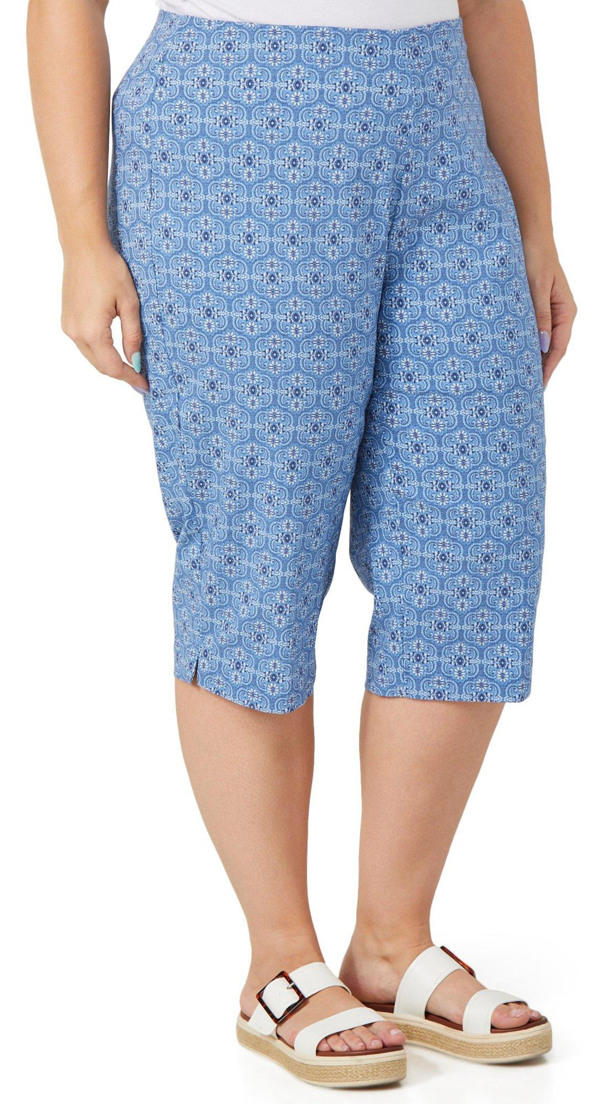 These vibrant Petal Pusher Capris bring bold energy to your wardrobe with their eye catching print and easy pull on style. Designed with an elastic comfort waist for a flexible fit, these capris offer all day comfort without sacrificing personality. Inseam measures 17 in. Fabrication is 76% rayon, 21% nylon, 3% spandex.