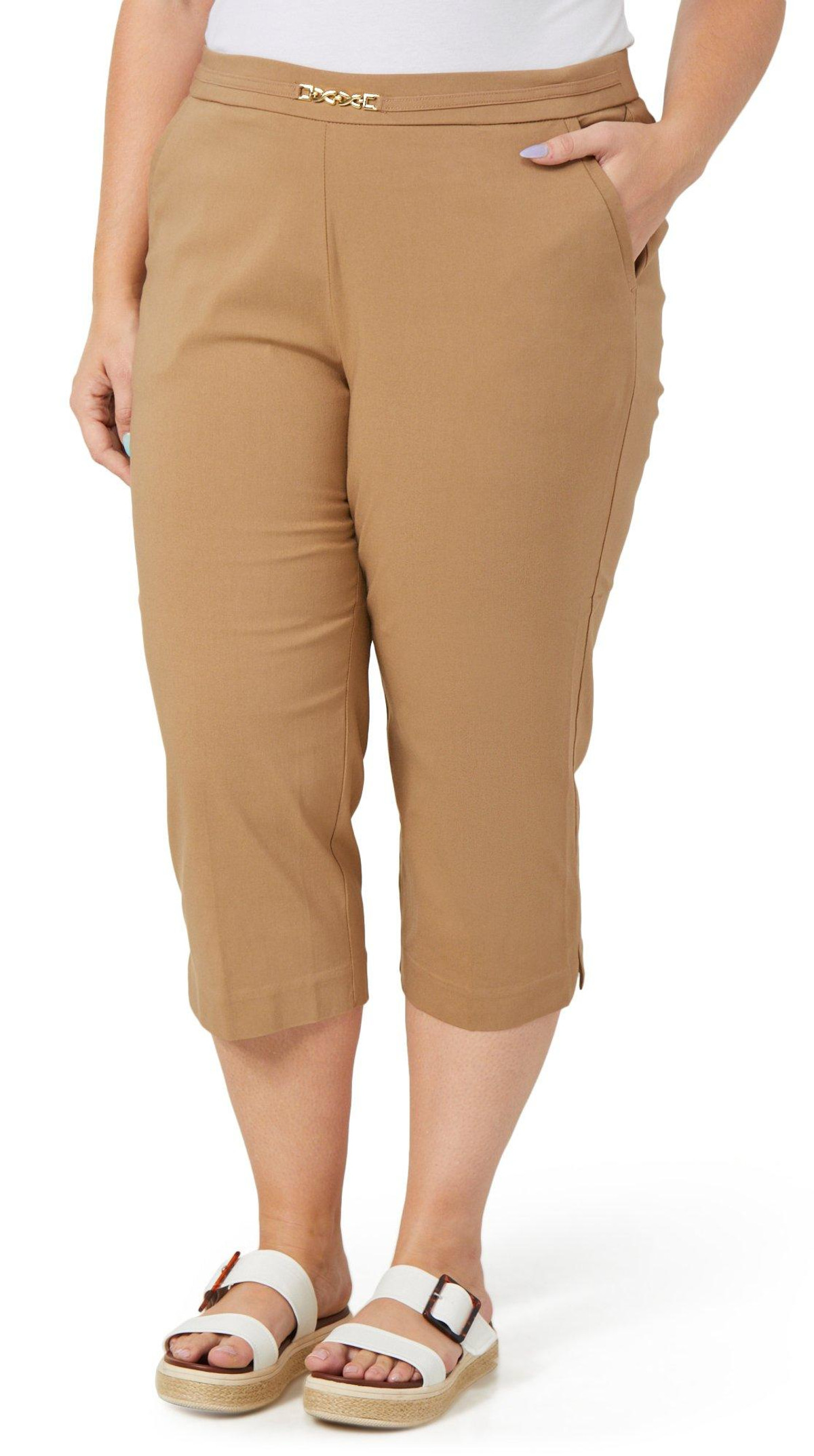 These stylish Capris feature a sleek solid color design with side seam pockets for a clean, modern look. A chic chain detail at the waist adds a touch of edge, making these perfect for dressing up or down. The capri length offers warm weather versatility while keeping comfort in mind. Inseam measures 21 in. Fabrication is 75% rayon, 22% nylon, 3% spandex.