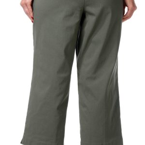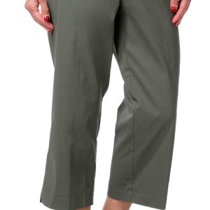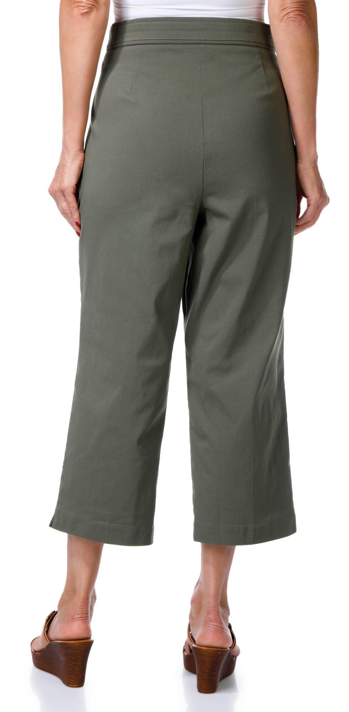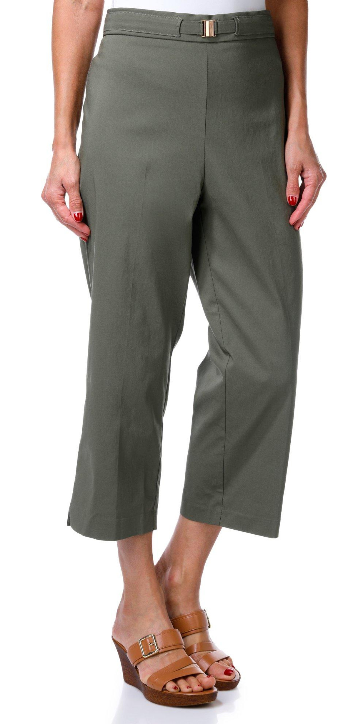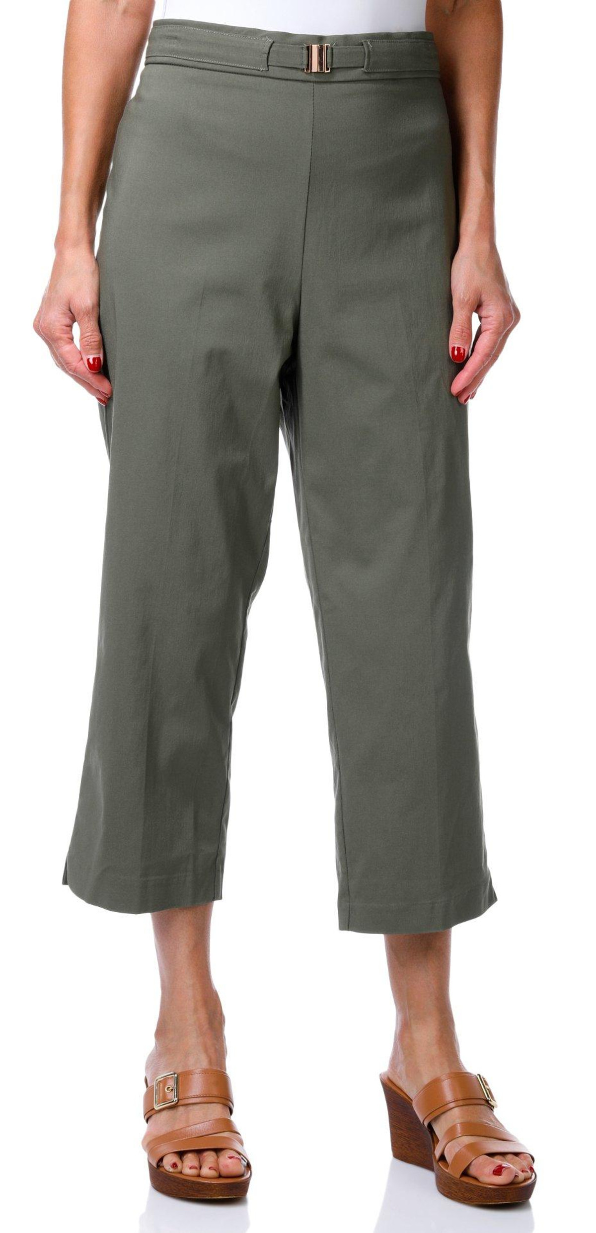 These Slim Crop Capris offer polished comfort with a chic cropped length and sleek faux back pockets. A gold button waist trim lends an elevated touch to the look. The fabrication is 76% rayon, 21% nylon, and 3% spandex with 100% cotton trim. Designed for all-day ease, they are easy care and machine washable. Inseam measures approximately 22 inches.