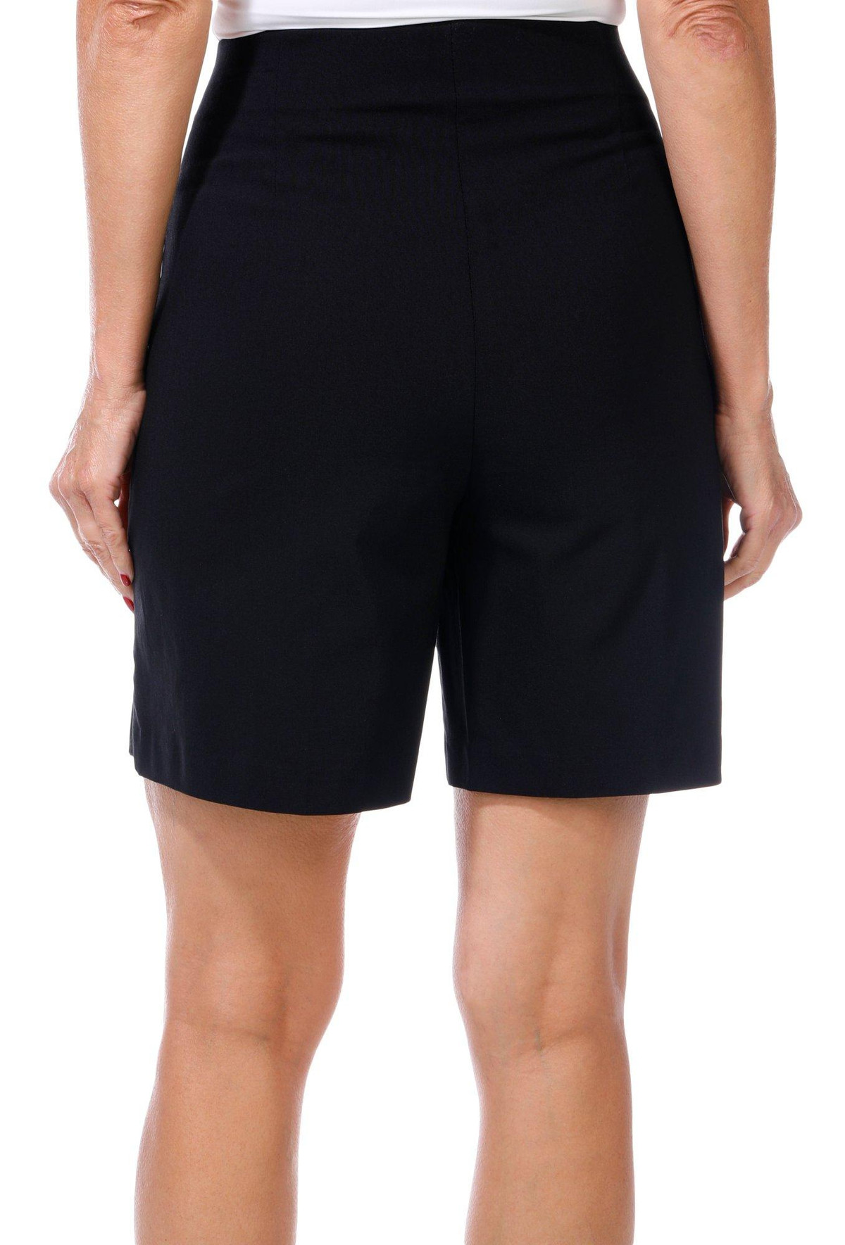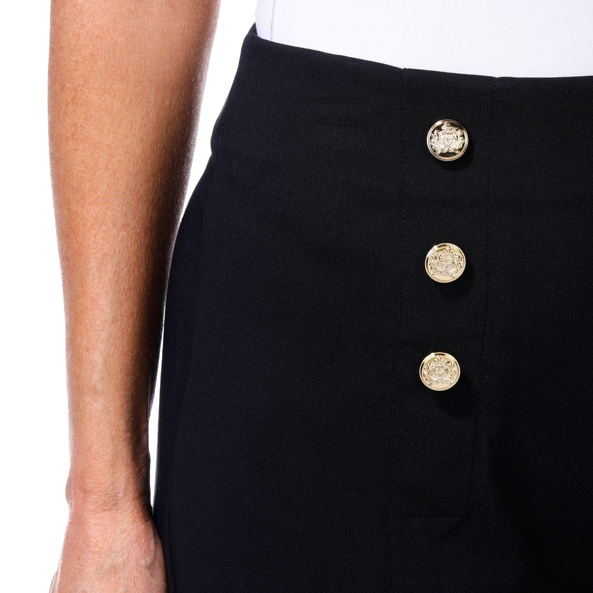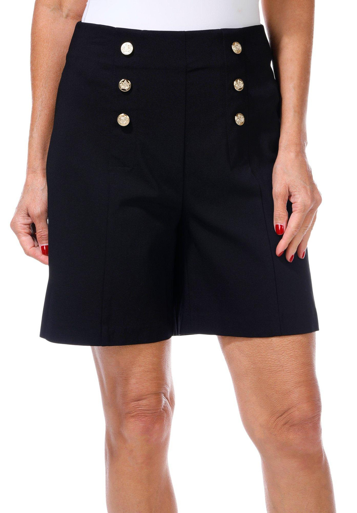 Make waves in style with these Super Stretch Sailor Shorts. Featuring a flattering fit that molds to your body, they showcase six gold buttons, three on each side of the front panel with detailed designs that add a bold nautical flair. With a smooth silhouette and no pockets, these shorts are a chic choice for sun-soaked days.
