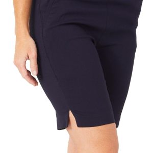 These shorts feature a solid color design on lightweight stretch fabric, a flat front with decorative chain detail on waistband, an elastic waist, and a classic fit. The inseam measures approximately 9 in. Fabrication