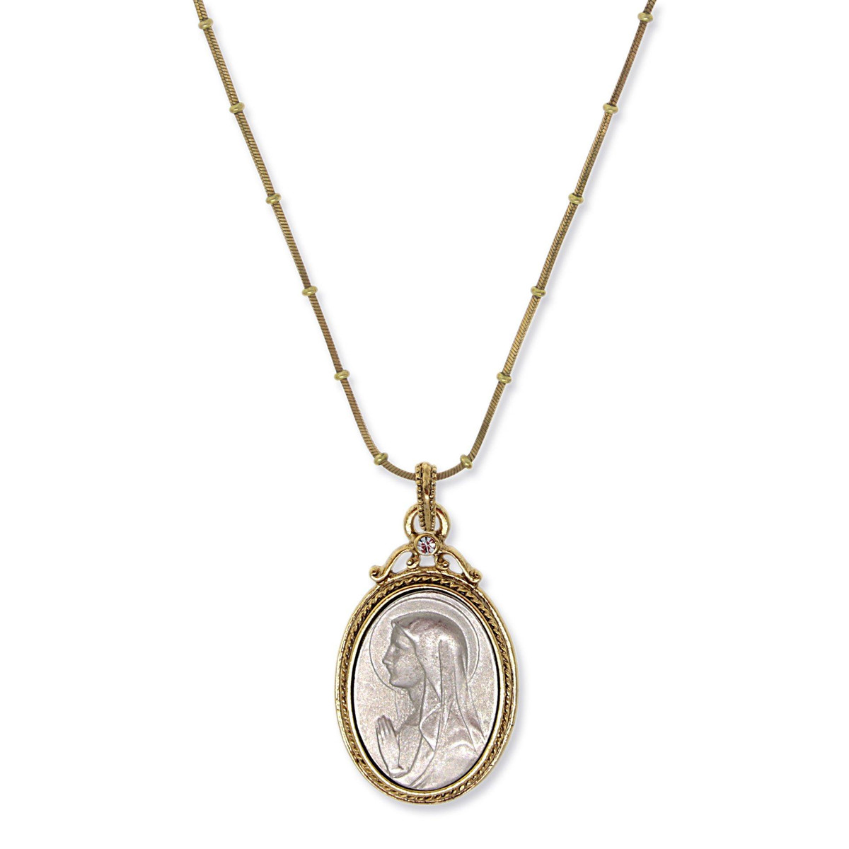 Adorn yourself with this elegant 14K gold-dipped necklace, featuring a vintage-inspired Virgin Mary medal set in an oval frame. The clear crystal accent adds a touch of sparkle, enhancing its unique and cameo-inspired design. This sophisticated piece is perfect for adding a timeless and graceful touch to any outfit. Length 20 in., width 25mm.