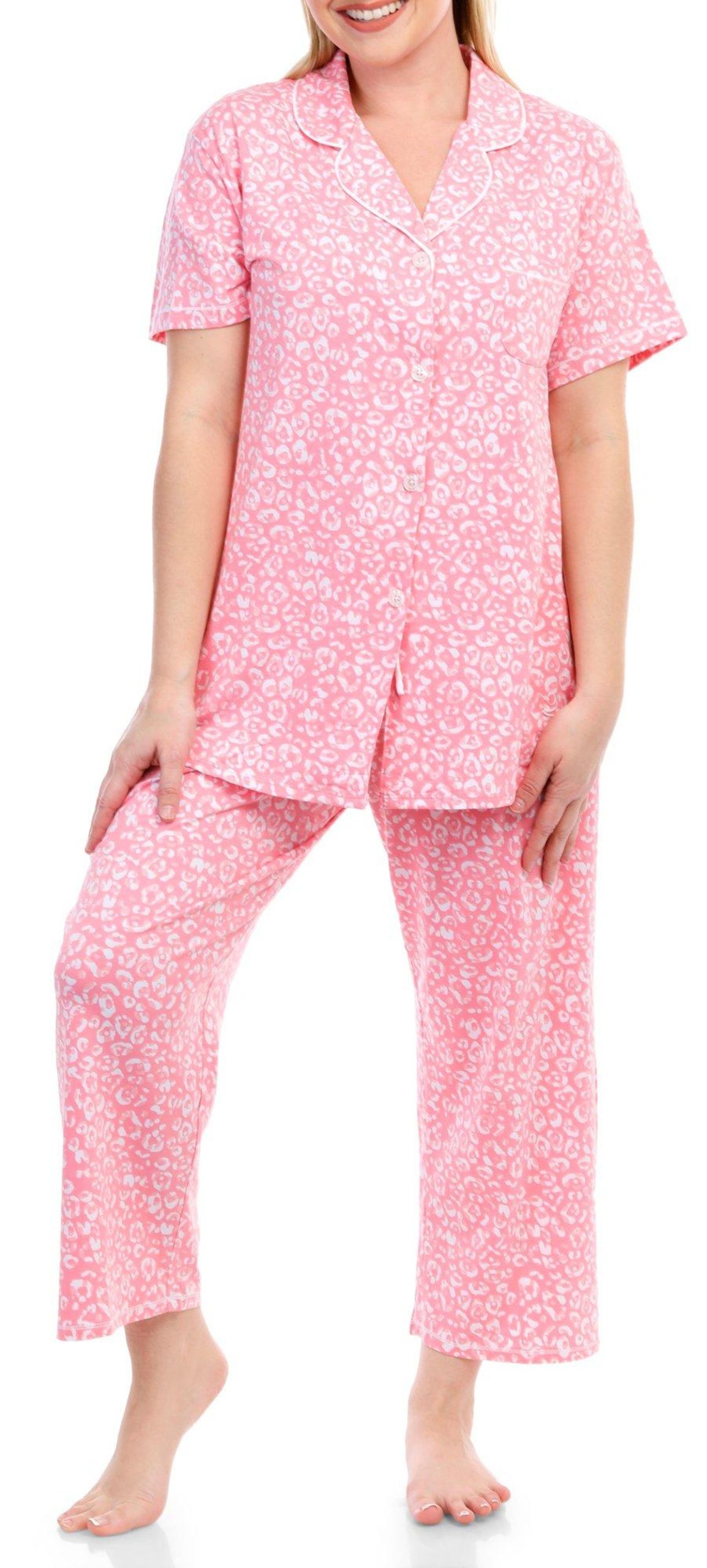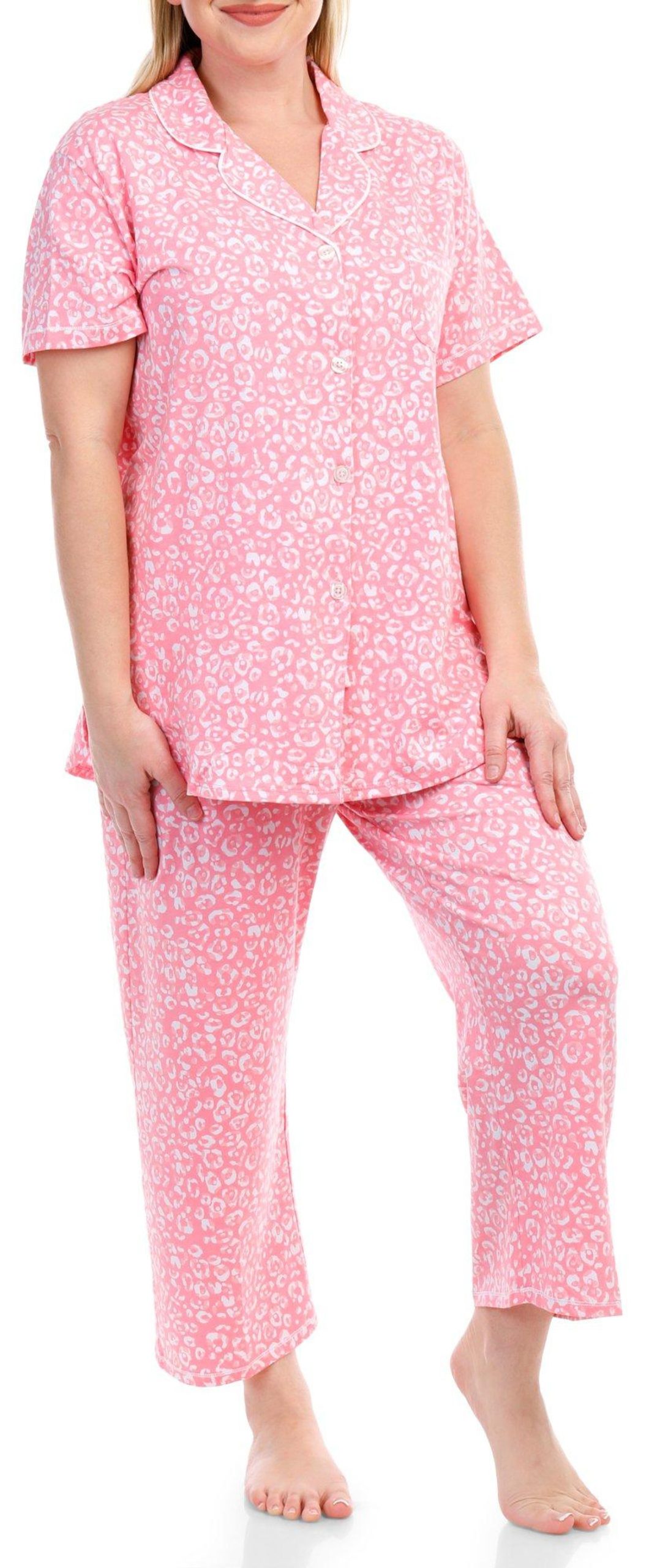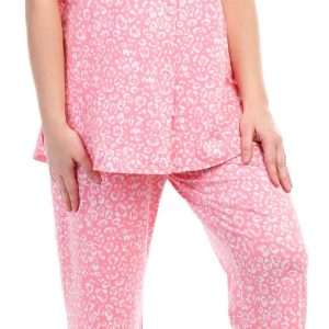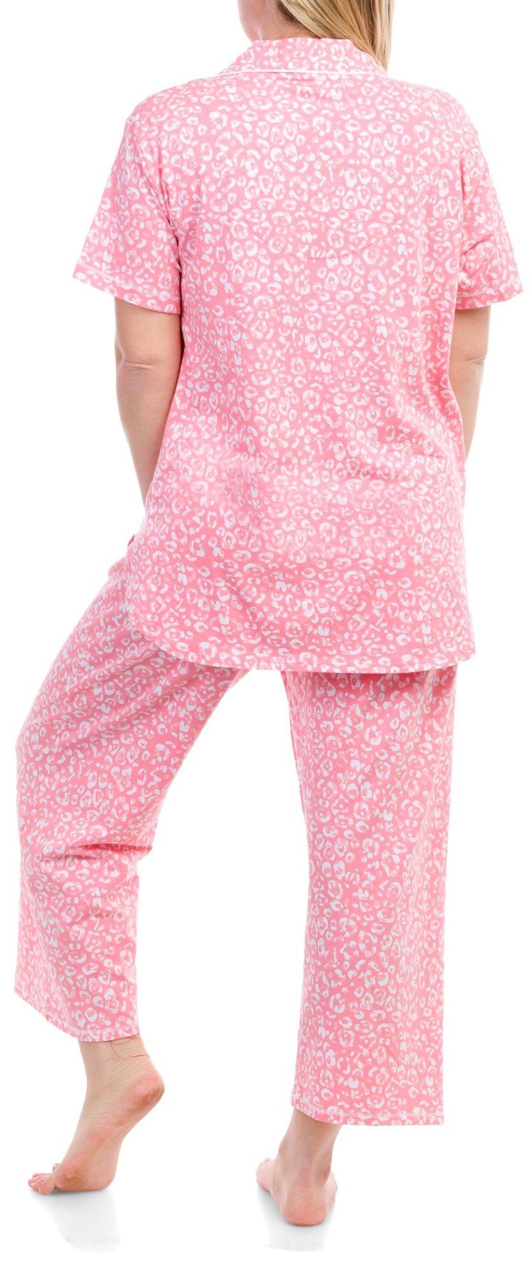 Unwind in style with this 2-piece Sleepwear Set, featuring a playful animal print pattern. This set includes capris with a drawstring waistband for a perfect fit and a short sleeve button-down top with a convenient chest pocket. The combination of the relaxed capris and the stylish top ensures you stay comfortable and chic, whether you’re lounging at home or enjoying a cozy night’s sleep. Fabrication is 57% cotton, 38% rayon, and 5% spandex.