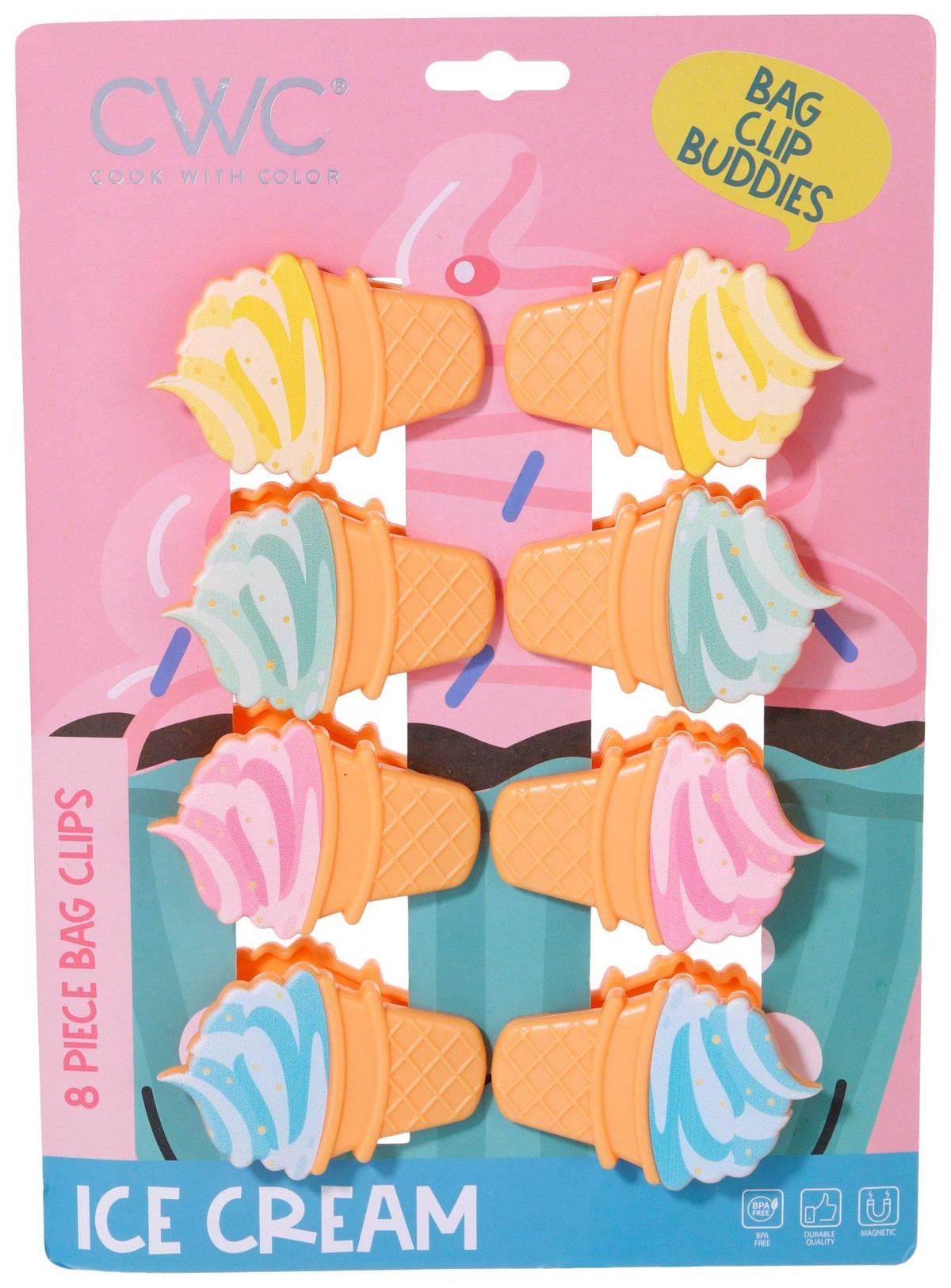 Keep snacks sealed and spaces sweet with this 8 pack of ice cream bag clips. Each clip features a built-in magnet for convenient storage on refrigerators or metal surfaces. Made from BPA free materials and styled in playful multi colors, these clips add a fun and functional twist to food storage.