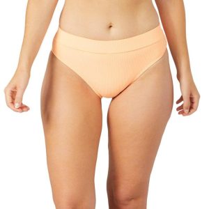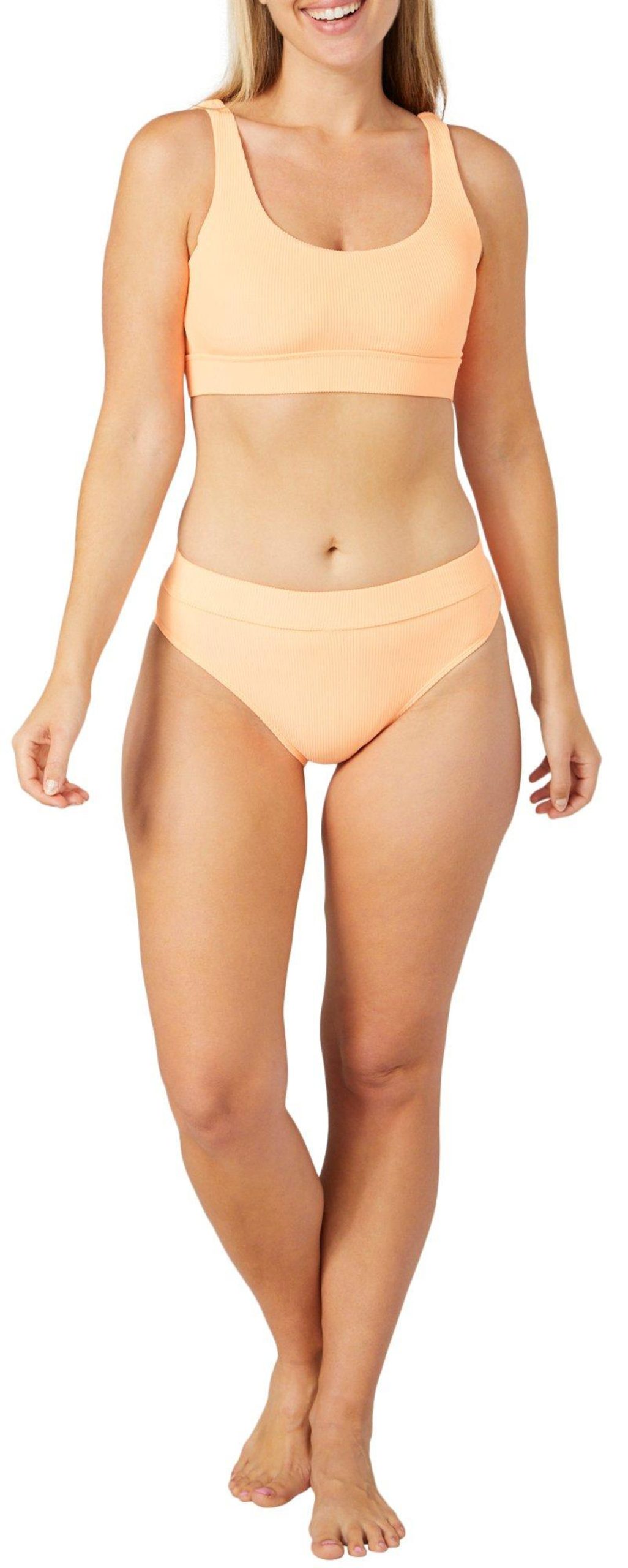 This bikini top features a solid color design on ribbed fabric, a scoop neckline, removable soft pads, fixed straps, and back hook closure. Fabrication 85% nylon, 15% spandex.