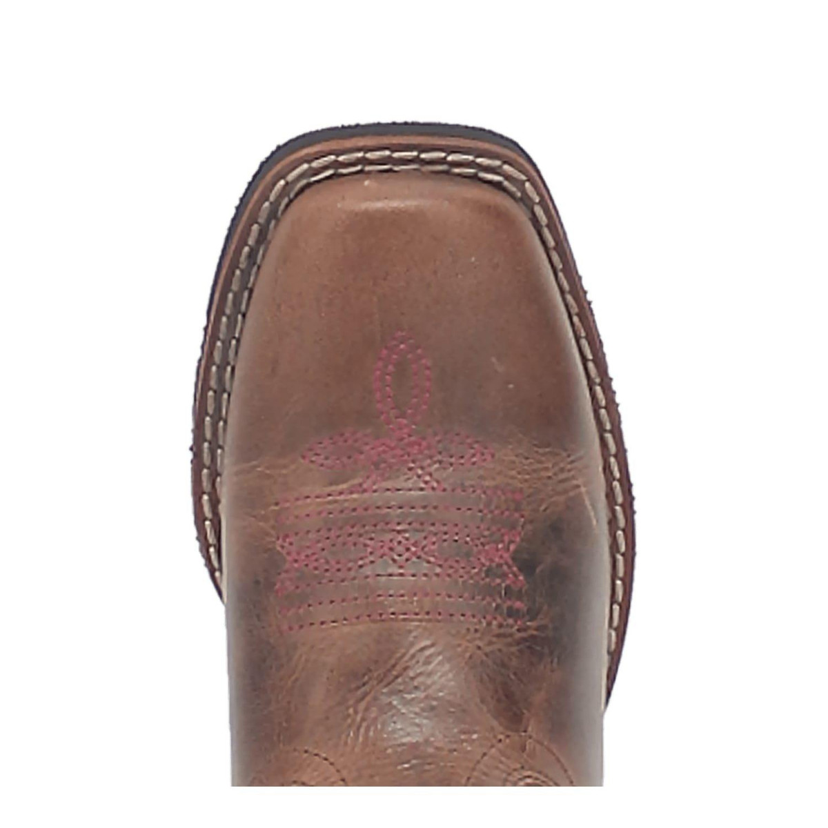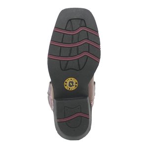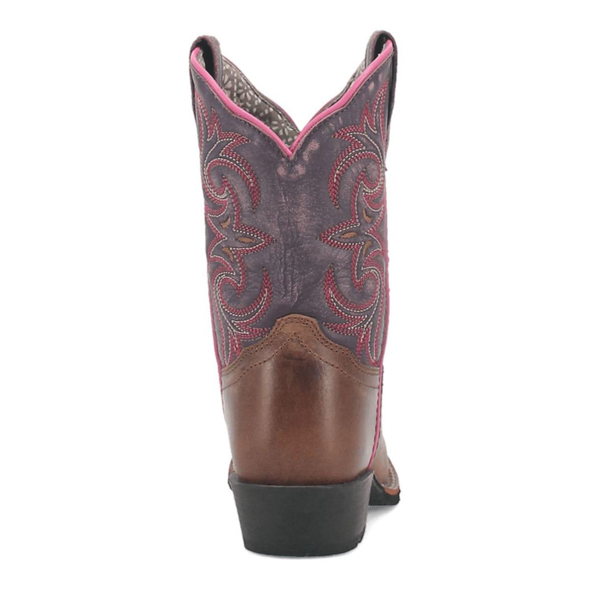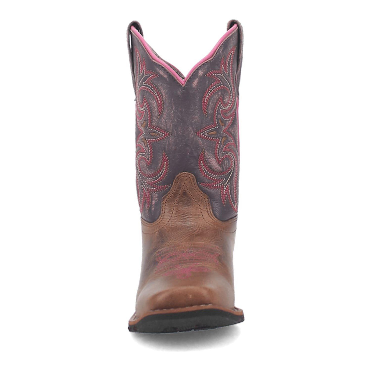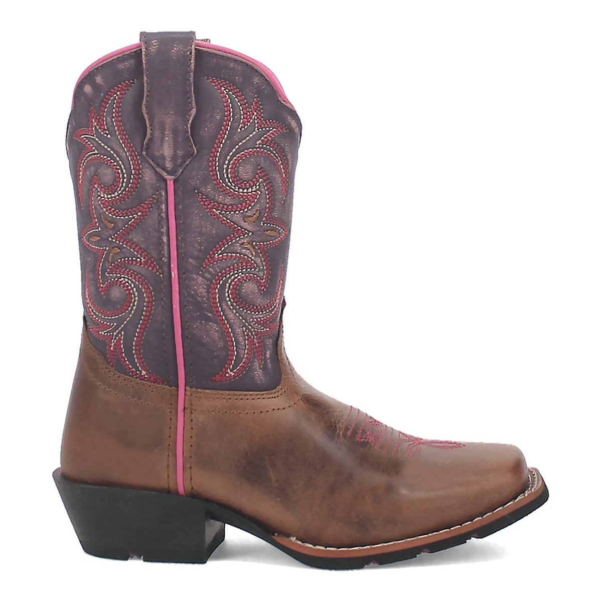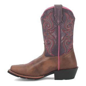 The Majesty is a darling boot with durable leather for life’s big adventures. The brown foot is paired with a purple shaft accented in pink stitching and piping. Also comes with a broad square toe, Comfort Cushion insole, and a rubber outsole for traction.