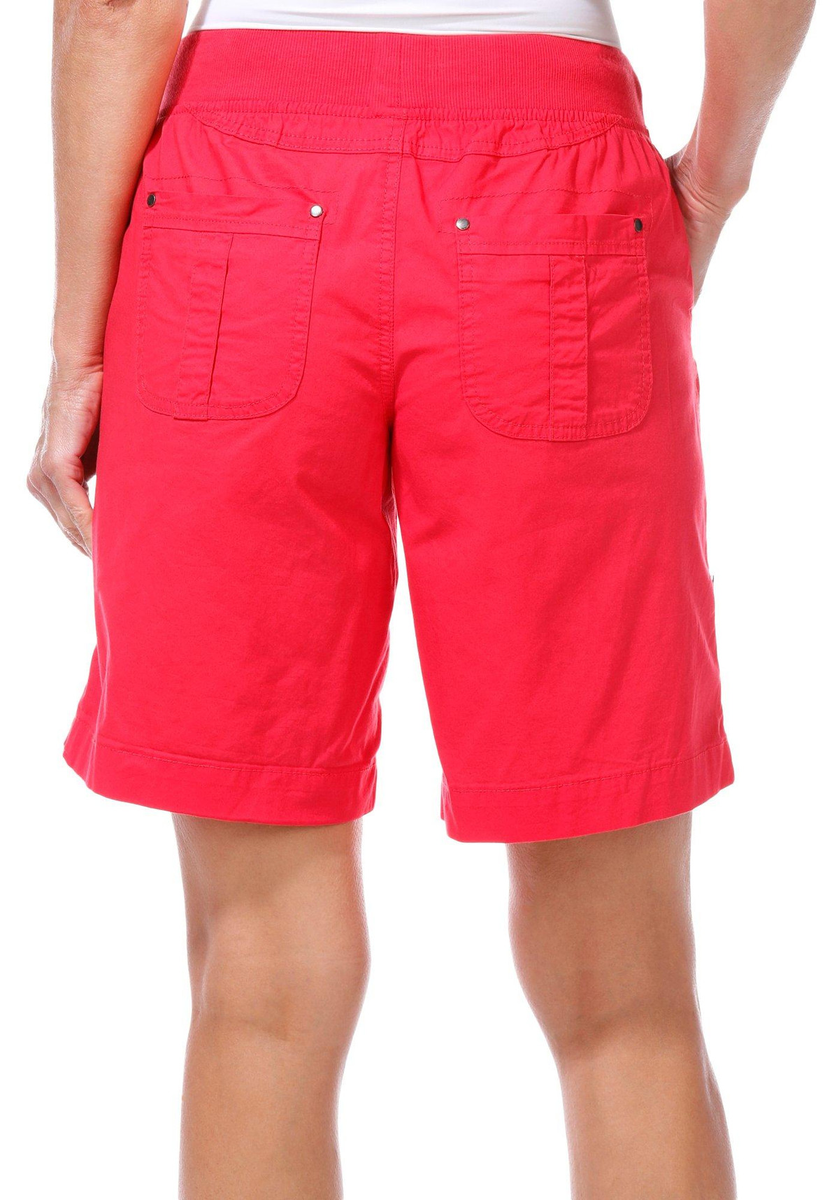 These pull-on Bermuda shorts feature a solid color design on lightweight cotton blend woven and knit fabrication, 2 front and back pockets, roll tab cuffed hemline, and a wide elastic ribbed waistband with adjustable drawstring for comfort fit. Inseam measures approximately 6 in. Outseam measures approximately 17 inches from waistband to hemline. Fabrication 98% cotton, 2% spandex.